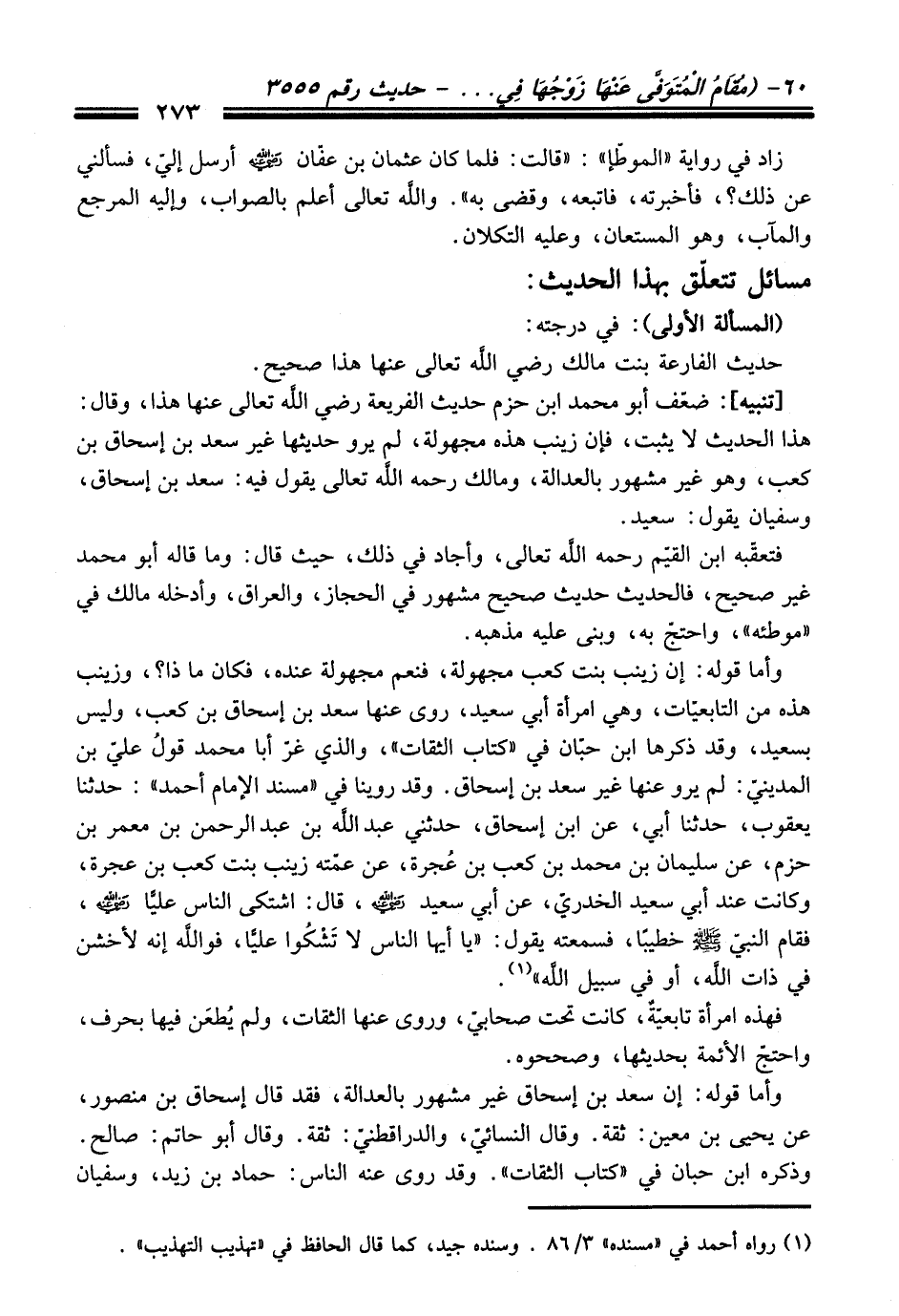 [تنبيه]: ضعّف أبو محمد ابن حزم حديث الفريعة - رضي اللَّه تعالى عنها - هذا، وقال: هذا الحديث لا يثبت، فإن زينب هذه مجهولة، لم يرو حديثها غير سعد بن إسحاق بن كعب، وهو غير مشهور بالعدالة، ومالك -رحمه اللَّه تعالى- يقول فيه: سعد بن إسحاق، وسفيان يقول: سعيد.