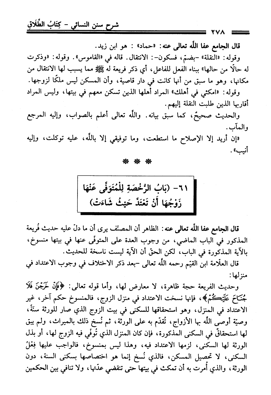 قال الجامع - عفا اللَّه تعالى عنه -: الظاهر أن المصنّف يرى أن ما دلّ عليه حديث فُريعة المذكور في الباب الماضي، من وجوب العدّة على المتوفّى عنها في بيتها منسوخ، بالآية المذكورة في الباب، لكن الحقّ أن الآية ليست ناسخة للحديث.