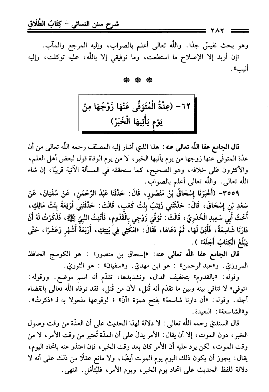3559 - (أَخْبَرَنَا إِسْحَاقُ بْنُ مَنْصُورٍ, قَالَ: حَدَّثَنَا عَبْدُ الرَّحْمَنِ, عَنْ سُفْيَانَ, عَنْ سَعْدِ بْنِ إِسْحَاقَ, قَالَ: حَدَّثَتْنِي زَيْنَبُ بِنْتُ كَعْبٍ, قَالَتْ: حَدَّثَتْنِي فُرَيْعَةُ بِنْتُ مَالِكٍ, أُخْتُ أَبِي سَعِيدٍ الْخُدْرِيِّ, قَالَتْ: تُوُفِّيَ زَوْجِي بِالْقَدُّومِ, فَأَتَيْتُ النَّبِيَّ - صلى اللَّه عليه وسلم -, فَذَكَرْتُ لَهُ أَنَّ دَارَنَا شَاسِعَةٌ, فَأَذِنَ لَهَا, ثُمَّ دَعَاهَا, فَقَالَ: «امْكُثِي فِي بَيْتِكِ, أَرْبَعَةَ أَشْهُرٍ وَعَشْرًا, حَتَّى يَبْلُغَ الْكِتَابُ أَجَلَهُ»).