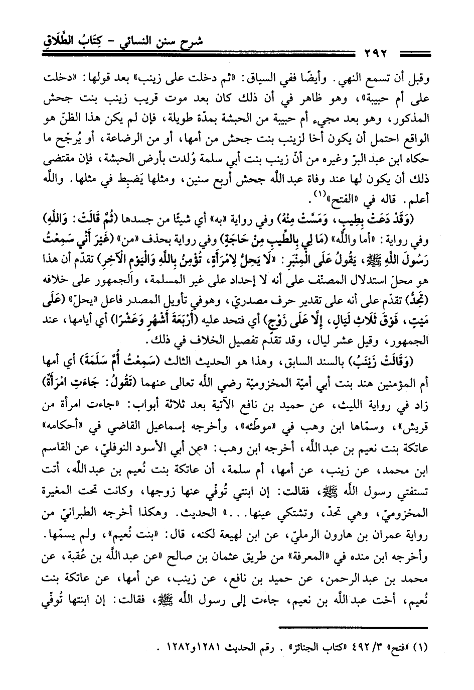 وأخرجه ابن منده في "المعرفة" من طريق عثمان بن صالح "عن عبد اللَّه بن عُقبة، عن محمد بن عبد الرحمن، عن حميد بن نافع، عن زينب، عن أمها، عن عاتكة بنت نُعيم، أخت عبد اللَّه بن نعيم، جاءت إلى رسول اللَّه - صلى اللَّه عليه وسلم -، فقالت: إن ابنتها تُوفّي
