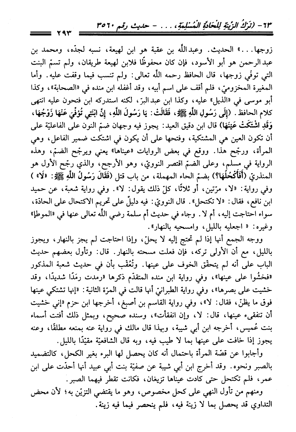 زوجها ... " الحديث. وعبد اللَّه بن عقبة هو ابن لهيعة، نسبه لجدّه، ومحمد بن عبد الرحمن هو أبو الأسود، فإن كان محفوظًا فلابن لهيعة طريقان، ولم تسمّ البنت التي توفّي زوجها، قال الحافظ -رحمه اللَّه تعالى-: ولم تنسب فيما وقفت عليه. وأما المغيرة المخزوميّ، فلم أقف على اسم أبيه، وقد أغفله ابن منده في "الصحابة"، وكذا أبو موسى في "الذيل" عليه، وكذا ابن عبد البرّ، لكنه استدركه ابن فتحون عليه انتهى كلام الحافظ. (إِلَى رَسُولِ اللَّهِ - صلى اللَّه عليه وسلم -، فَقَالَتْ: يَا رَسُولَ اللَّهِ، إِنَّ ابْنَتي تُوُفِّيَ عَنْهَا زَوْجُهَا، وَقَدِ اشْتَكَتْ عَيْنَهَا) قال ابن دقيق العيد: يجوز فيه وجهان ضمّ النون على الفاعليّة على أن تكون العين هي المشتكية، وفتحها على أن يكون في اشتكت ضمير الفاعل، وهي المرأة، ورجّح هذا. ووقع في بعض الروايات "عيناها" يعني ويرجّح الضمّ، وهذه الرواية في مسلم، وعلى الضمّ اقتصر النوويّ، وهو الأرجح، والذي رجّح الأول هو المنذريّ (أَفَأَكْحُلُهَا؟) بضمّ الحاء المهملة، من باب قتل (فَقَالَ رَسُولُ اللهِ - صلى اللَّه عليه وسلم -: "لَا") وفي رواية: "لا، مرَّتين، أو ثلاثًا، كلّ ذلك يقول: لا". وفي رواية شعبة، عن حميد ابن نافع، فقال: "لا تكتحل". قال النوويّ: فيه دليلٌ على تحريم الاكتحال على الحادّة، سواء احتاجت إليه، أم لا. وجاء في حديث أم سلمة - رضي اللَّه تعالى عنها - في "الموطأ" وغيره: "اجعليه بالليل، وامسحيه بالنهار".