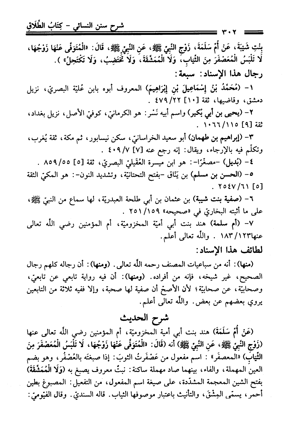 بِنْتِ شَيْبَةَ, عَنْ أُمِّ سَلَمَةَ, زَوْجِ النَّبِيِّ - صلى اللَّه عليه وسلم -, عَنِ النَّبِيِّ - صلى اللَّه عليه وسلم -, قَالَ: «الْمُتَوَفَّى عَنْهَا زَوْجُهَا, لاَ تَلْبَسُ الْمُعَصْفَرَ مِنَ الثِّيَابِ, وَلاَ الْمُمَشَّقَةَ, وَلاَ تَخْتَضِبُ, وَلاَ تَكْتَحِلُ»).
