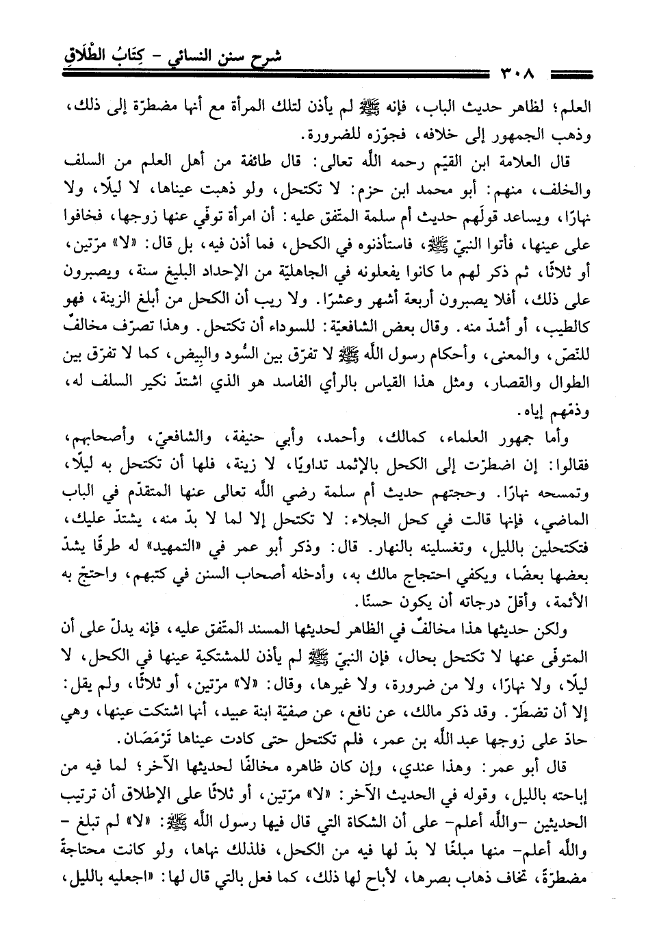 وأما جمهور العلماء، كمالك، وأحمد، وأبي حنيفة، والشافعيّ، وأصحابهم، فقالوا: إن اضطرّت إلى الكحل بالإثمد تداويًا، لا زينة، فلها أن تكتحل به ليلًا، وتمسحه نهارًا. وحجتهم حديث أم سلمة - رضي اللَّه تعالى عنها - المتقدّم في الباب الماضي، فإنها قالت في كحل الجلاء: لا تكتحل إلا لما لا بدّ منه، يشتدّ عليك، فتكتحلين بالليل، وتغسلينه بالنهار. قال: وذكر أبو عمر في "التمهيد" له طرقًا يشدّ بعضها بعضًا، ويكفي احتجاج مالك به، وأدخله أصحاب السنن في كتبهم، واحتجّ به الأئمة، وأقلّ درجاته أن يكون حسنًا.