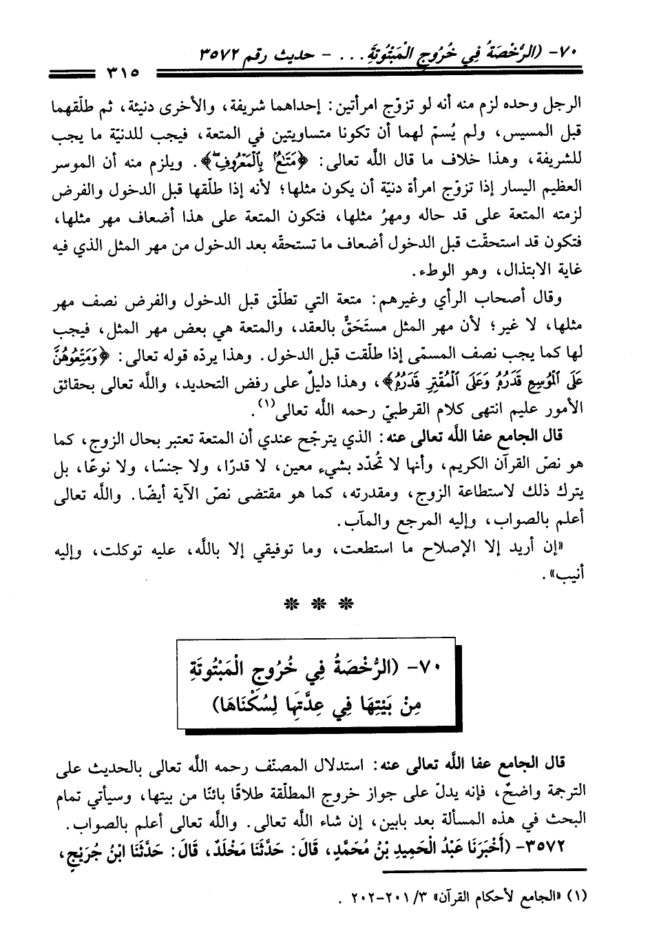 70 - (الرُّخْصَةُ فِي خُرُوجِ الْمَبْتُوتَةِ مِنْ بَيْتِهَا فِي عِدّتِهَا لِسُكْنَاهَا)