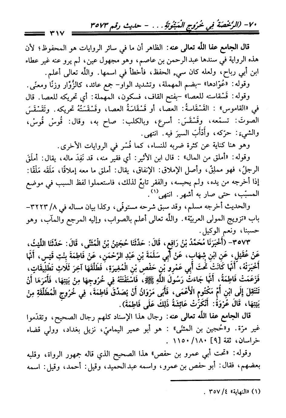 3573 - (أَخْبَرَنَا مُحَمَّدُ بْنُ رَافِعٍ, قَالَ: حَدَّثَنَا حُجَيْنُ بْنُ الْمُثَنَّى, قَالَ: حَدَّثَنَا اللَّيْثُ, عَنْ عُقَيْلٍ, عَنِ ابْنِ شِهَابٍ, عَنْ أَبِي سَلَمَةَ بْنِ عَبْدِ الرَّحْمَنِ, عَنْ فَاطِمَةَ بِنْتِ قَيْسٍ, أَنَّهَا أَخْبَرَتْهُ, أَنَّهَا كَانَتْ تَحْتَ أَبِي عَمْرِو بْنِ حَفْصِ بْنِ الْمُغِيرَةِ, فَطَلَّقَهَا آخِرَ ثَلاَثِ تَطْلِيقَاتٍ, فَزَعَمَتْ فَاطِمَةُ, أَنَّهَا جَاءَتْ رَسُولَ اللهِ - صلى اللَّه عليه وسلم -, فَاسْتَفْتَتْهُ فِي خُرُوجِهَا مِنْ بَيْتِهَا, فَأَمَرَهَا أَنْ تَنْتَقِلَ إِلَى ابْنِ أُمِّ مَكْتُومٍ الأَعْمَى, فَأَبَى مَرْوَانُ أَنْ يُصَدِّقَ فَاطِمَةَ, فِي خُرُوجِ الْمُطَلَّقَةِ مِنْ بَيْتِهَا, قَالَ عُرْوَةُ: أَنْكَرَتْ عَائِشَةُ ذَلِكَ عَلَى فَاطِمَةَ).