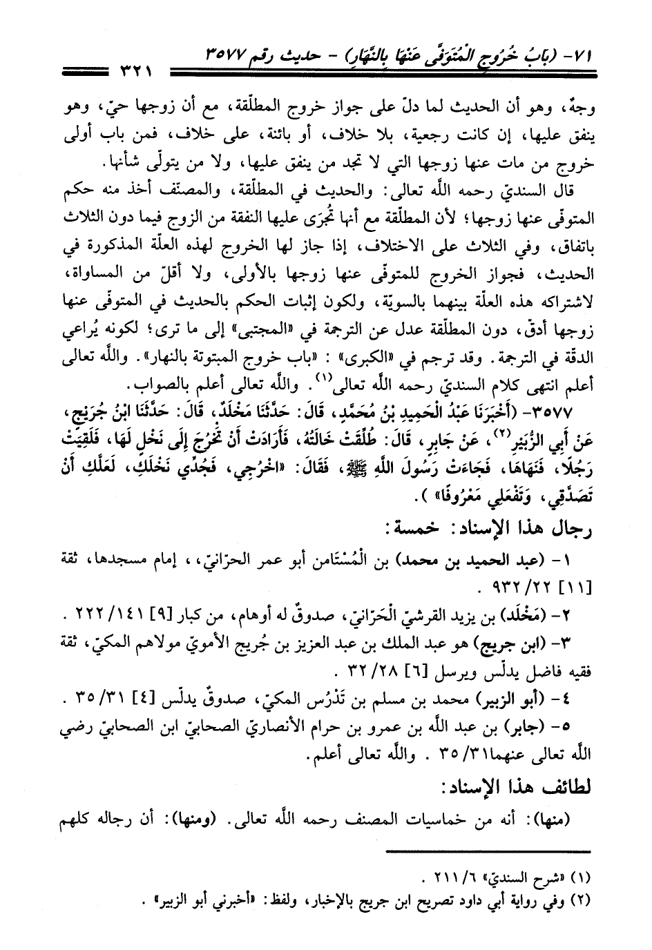 3577 - (أَخْبَرَنَا عَبْدُ الْحَمِيدِ بْنُ مُحَمَّدٍ, قَالَ: حَدَّثَنَا مَخْلَدٌ, قَالَ: حَدَّثَنَا ابْنُ جُرَيْجٍ, عَنْ أَبِي الزُّبَيْرِ (¬2) , عَنْ جَابِرٍ, قَالَ: طُلِّقَتْ خَالَتُهُ, فَأَرَادَتْ أَنْ تَخْرُجَ إِلَى نَخْلٍ لَهَا, فَلَقِيَتْ رَجُلاً, فَنَهَاهَا, فَجَاءَتْ رَسُولَ اللهِ - صلى اللَّه عليه وسلم -, فَقَالَ: «اخْرُجِي, فَجُدِّي نَخْلَكِ, لَعَلَّكِ أَنْ تَصَدَّقِي, وَتَفْعَلِي مَعْرُوفًا»).