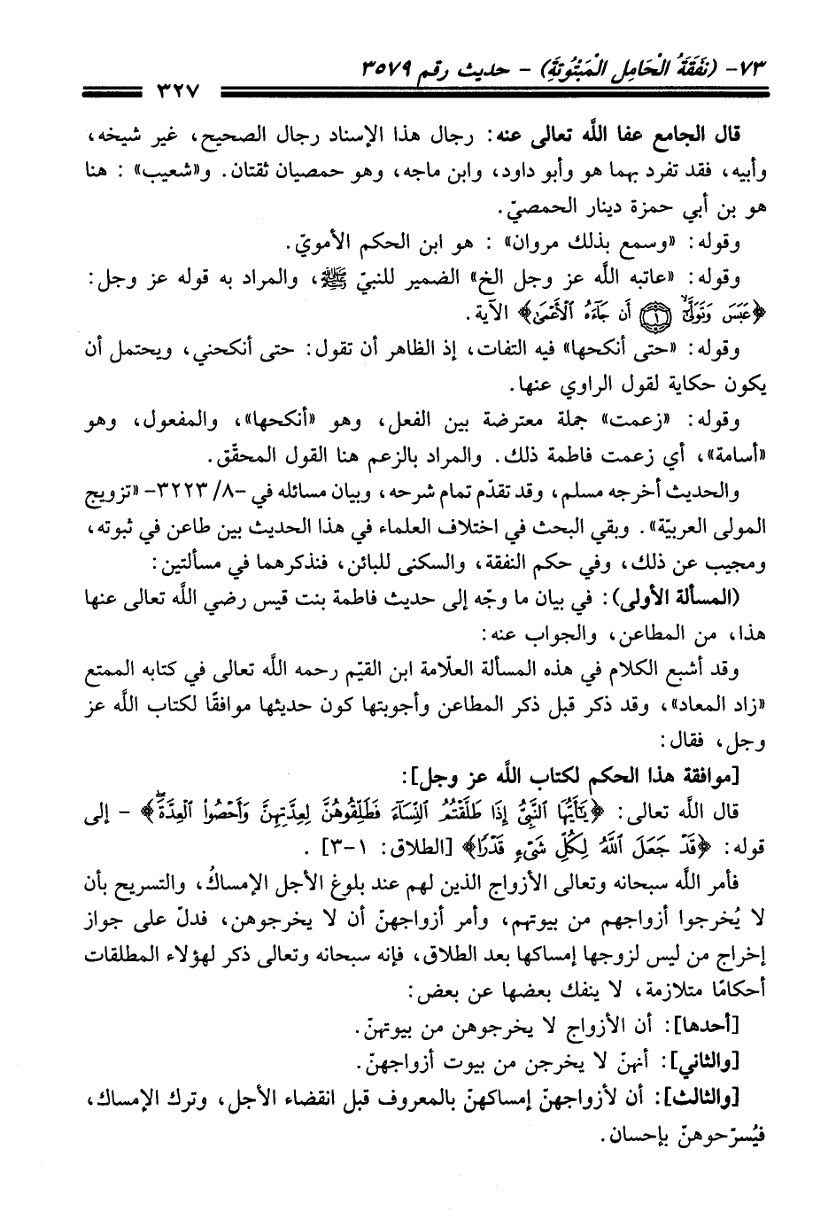 والحديث أخرجه مسلم، وقد تقدّم تمام شرحه، وبيان مسائله في -8/ 3223 - "تزويج المولى العربيّة". وبقي البحث في اختلاف العلماء في هذا الحديث بين طاعن في ثبوته، ومجيب عن ذلك، وفي حكم النفقة، والسكنى للبائن، فنذكرهما في مسألتين: