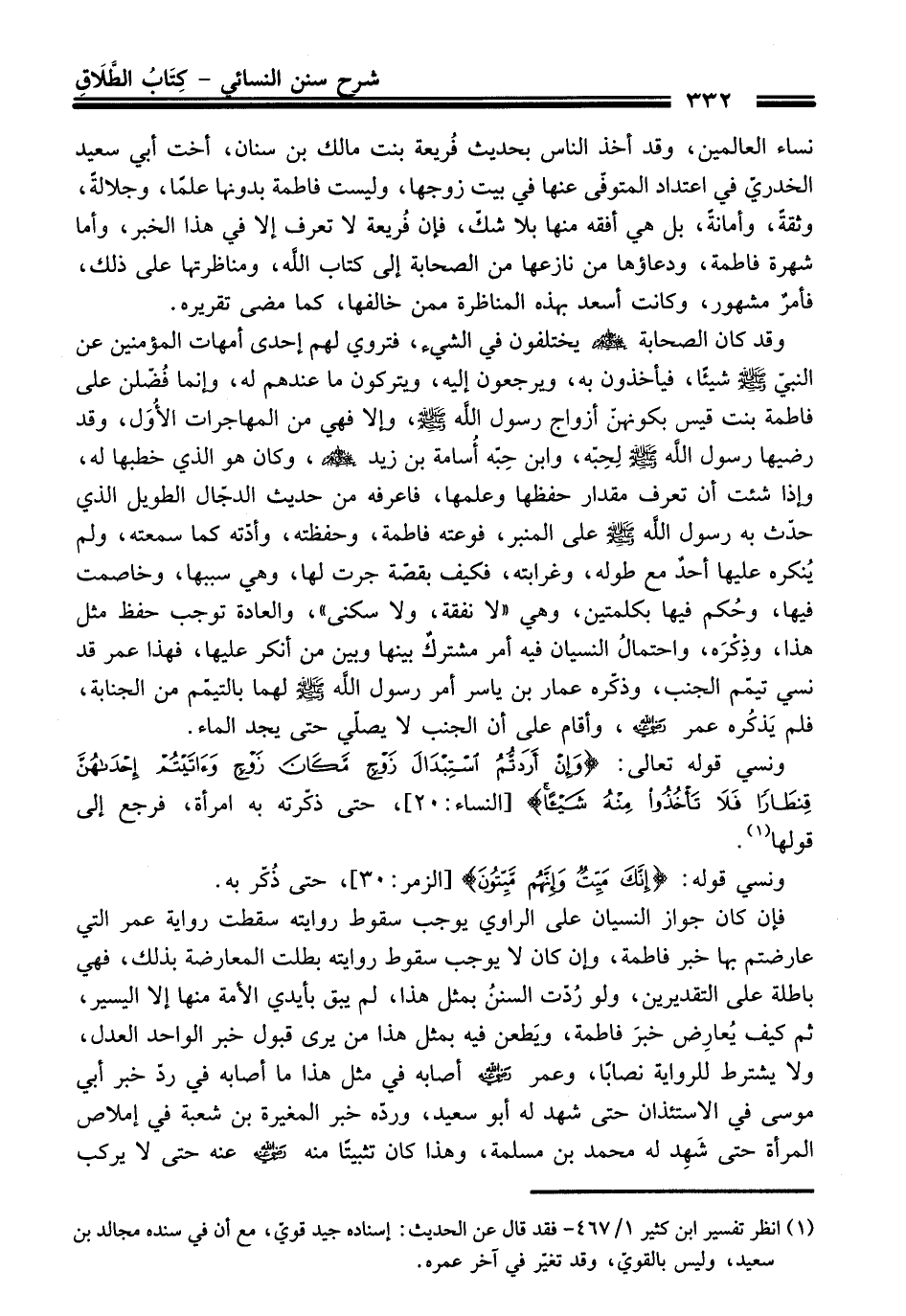 نساء العالمين، وقد أخذ الناس بحديث فُريعة بنت مالك بن سنان، أخت أبي سعيد الخدريّ في اعتداد المتوفّى عنها في بيت زوجها، وليست فاطمة بدونها علمًا، وجلالةً، وثقةً، وأمانةً، بل هي أفقه منها بلا شكّ، فإن فُريعة لا تعرف إلا في هذا الخبر، وأما شهرة فاطمة، ودعاؤها من نازعها من الصحابة إلى كتاب اللَّه، ومناظرتها على ذلك، فأمرٌ مشهور، وكانت أسعد بهذه المناظرة ممن خالفها، كما مضى تقريره.