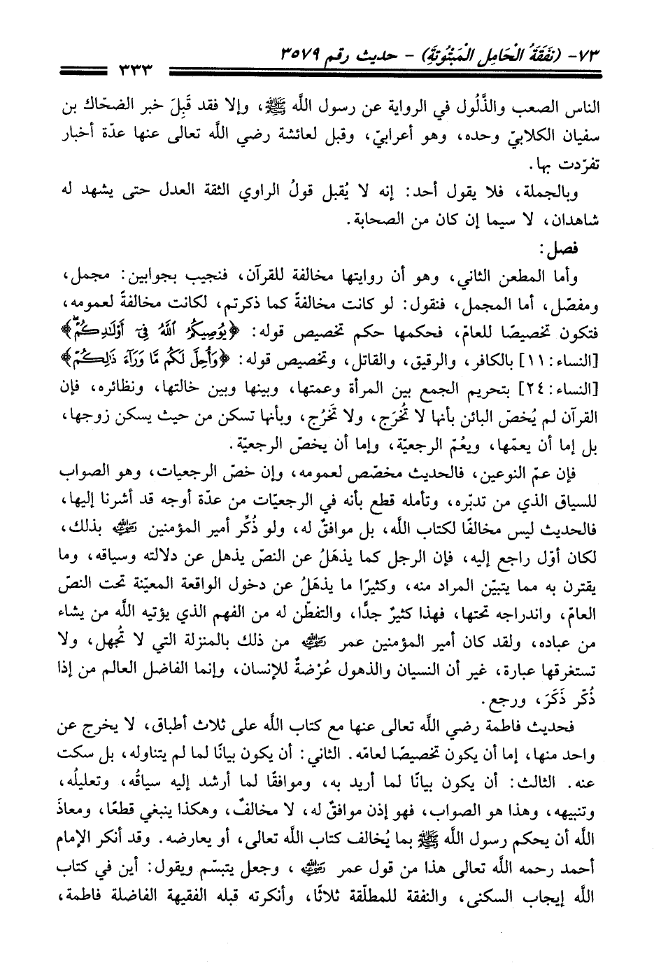 فإن عمّ النوعين، فالحديث مخصّص لعمومه، وإن خصّ الرجعيات، وهو الصواب للسياق الذي من تدبّره، وتأمله قطع بأنه في الرجعيّات من عدّة أوجه قد أشرنا إليها، فالحديث ليس مخالفًا لكتاب اللَّه، بل موافقٌ له، ولو ذُكر أمير المؤمنين - رضي اللَّه عنه - بذلك، لكان أوّل راجع إليه، فإن الرجل كما يذهَلُ عن النصّ يذهل عن دلالته وسياقه، وما يقترن به مما يتبيّن المراد منه، وكثيرًا ما يذهلُ عن دخول الواقعة المعيّنة تحت النصّ العامّ، واندراجه تحتها، فهذا كثيرٌ جدًّا، والتفطّن له من الفهم الذي يؤتيه اللَّه من يشاء من عباده، ولقد كان أمير المؤمنين عمر - رضي اللَّه عنه - من ذلك بالمنزلة التي لا تُجهل، ولا تستغرقها عبارة، غير أن النسيان والذهول عُرْضةٌ للإنسان، وإنما الفاضل العالم من إذا ذُكّر ذَكَرَ، ورجع.
