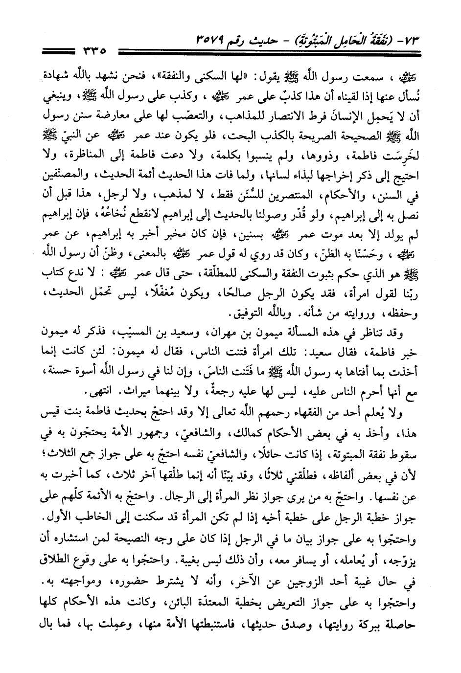 - رضي اللَّه عنه -، سمعت رسول اللَّه - صلى اللَّه عليه وسلم - يقول: "لها السكنى والنفقة"، فنحن نشهد باللَّه شهادة نُسأل عنها إذا لقيناه أن هذا كذبٌ على عمر - رضي اللَّه عنه -، وكذب على رسول اللَّه - صلى اللَّه عليه وسلم -، وينبغي أن لا يَحمِل الإنسان فرط الانتصار للمذاهب، والتعصّب لها على معارضة سنن رسول اللَّه - صلى اللَّه عليه وسلم - الصحيحة الصريحة بالكذب البحت، فلو يكون عند عمر - رضي اللَّه عنه - عن النبيّ - صلى اللَّه عليه وسلم -لخرِسَت فاطمة، وذووها، ولم ينسبوا بكلمة، ولا دعت فاطمة إلى المناظرة، ولا احتيج إلى ذكر إخراجها لبذاء لسانها، ولما فات هذا الحديث أئمة الحديث، والمصنّفين في السنن، والأحكام، المنتصرين للسُّنَنَ فقط، لا لمذهب، ولا لرجل، هذا قبل أن نصل به إلى إبراهيم، ولو قُدّر وصولنا بالحديث إلى إبراهيم لانقطع نُخاعُهُ، فإن إبراهيم لم يولد إلا بعد موت عمر - رضي اللَّه عنه - بسنين، فإن كان مخبر أخبر به إبراهيم، عن عمر - رضي اللَّه عنه -، وحَسّنَا به الظنّ، وكان قد روي له قول عمر - رضي اللَّه عنه - بالمعنى، وظنّ أن رسول اللَّه - صلى اللَّه عليه وسلم - هو الذي حكم بثبوت النفقة والسكنى للمطلّقة، حتى قال عمر - رضي اللَّه عنه -: لا ندع كتاب ربّنا لقول امرأة، فقد يكون الرجل صالحًا، ويكون مُغفّلاً، ليس تحمّل الحديث، وحفظه، وروايته من شأنه. وباللَّه التوفيق.