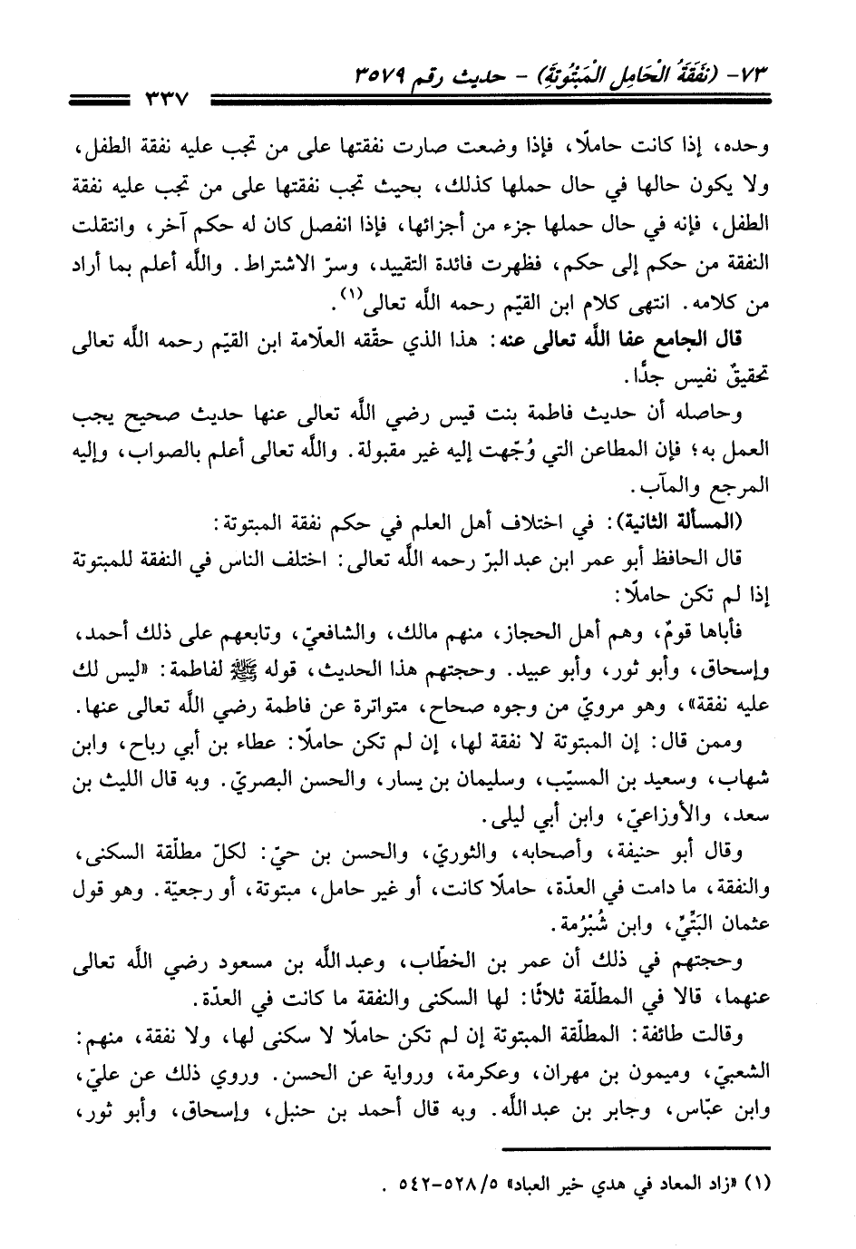 وحده، إذا كانت حاملًا، فإذا وضعت صارت نفقتها على من تجب عليه نفقة الطفل، ولا يكون حالها في حال حملها كذلك، بحيث تجب نفقتها على من تجب عليه نفقة الطفل، فإنه في حال حملها جزء من أجزائها، فإذا انفصل كان له حكم آخر، وانتقلت النفقة من حكم إلى حكم، فظهرت فائدة التقييد، وسرّ الاشتراط. واللَّه أعلم بما أراد من كلامه. انتهى كلام ابن القيّم -رحمه اللَّه تعالى- (¬1).