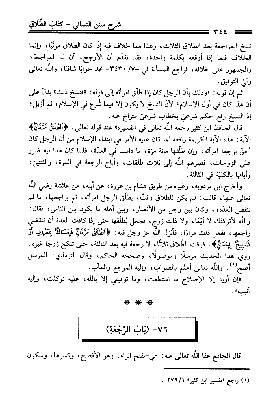 نسخ المراجعة بعد الطلاق الثلاث، وهذا مما خلاف فيه إِذا كان الطلاق مرتّبًا، وإنما الخلاف فيما إذا أوقعه بكلمة واحدة، فقد تقدّم أن الأرجح، أن له المراجعة؛ والجمهور على خلافه، فراجع المسألة في -7/ 3430 - تجد جوابًا شافيًا، واللَّه تعالى وليّ التوفيق.