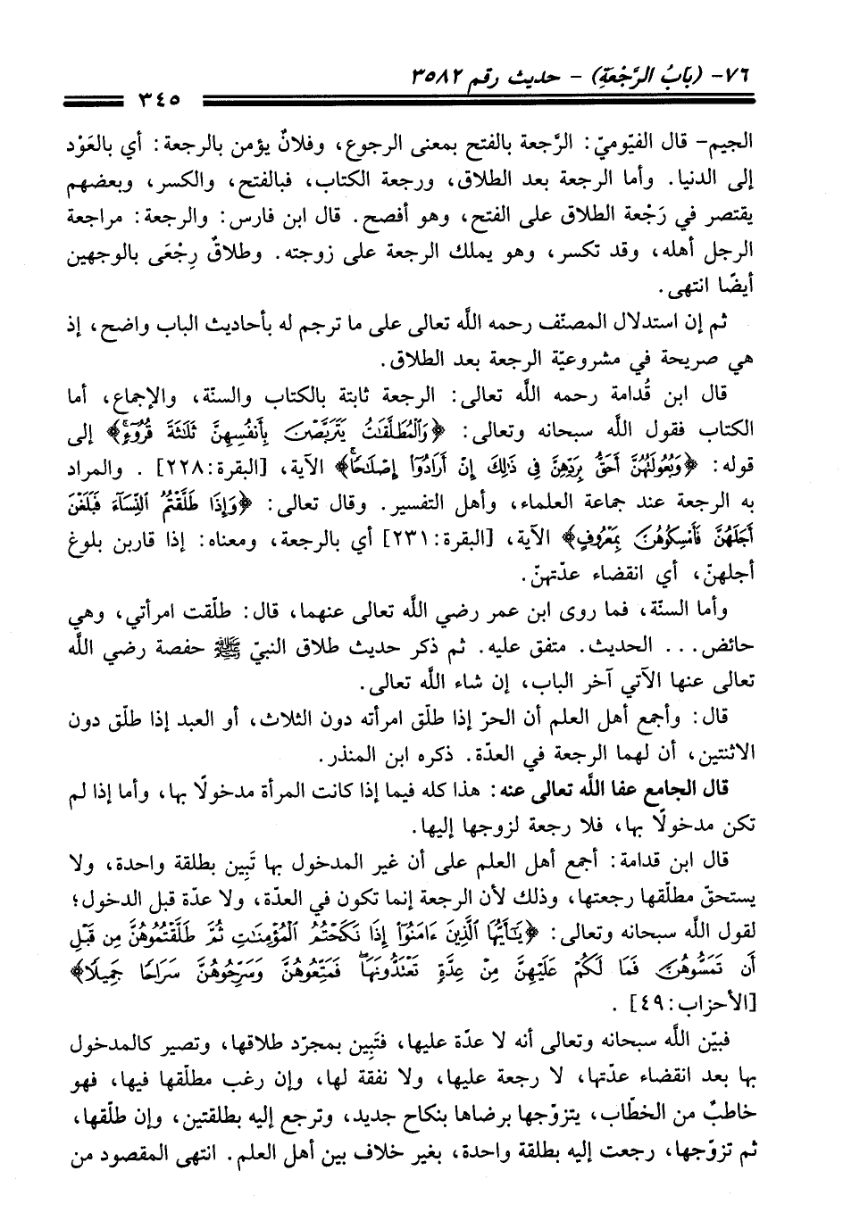 قال ابن قُدامة -رحمه اللَّه تعالى-: الرجعة ثابتة بالكتاب والستة، والإجماع، أما الكتاب فقدل اللَّه سبحانه وتعالى: {وَالْمُطَلَّقَاتُ يَتَرَبَّصْنَ بِأَنْفُسِهِنَّ ثَلَاثَةَ قُرُوءٍ} إلى قوله: {وَبُعُولَتُهُنَّ أَحَقُّ بِرَدِّهِنَّ فِي ذَلِكَ إِنْ أَرَادُوا إِصْلَاحًا} الآية, [البقرة: 228]. والمراد به الرجعة عند جماعة العلماء، وأهل التفسير. وقال تعالى: {وَإِذَا طَلَّقْتُمُ النِّسَاءَ فَبَلَغْنَ أَجَلَهُنَّ فَأَمْسِكُوهُنَّ بِمَعْرُوفٍ} الآية، [البقرة: 231] أي بالرجعة، ومعناه: إذا قاربن بلوغ أجلهنّ، أي انقضاء عدّتهنّ.