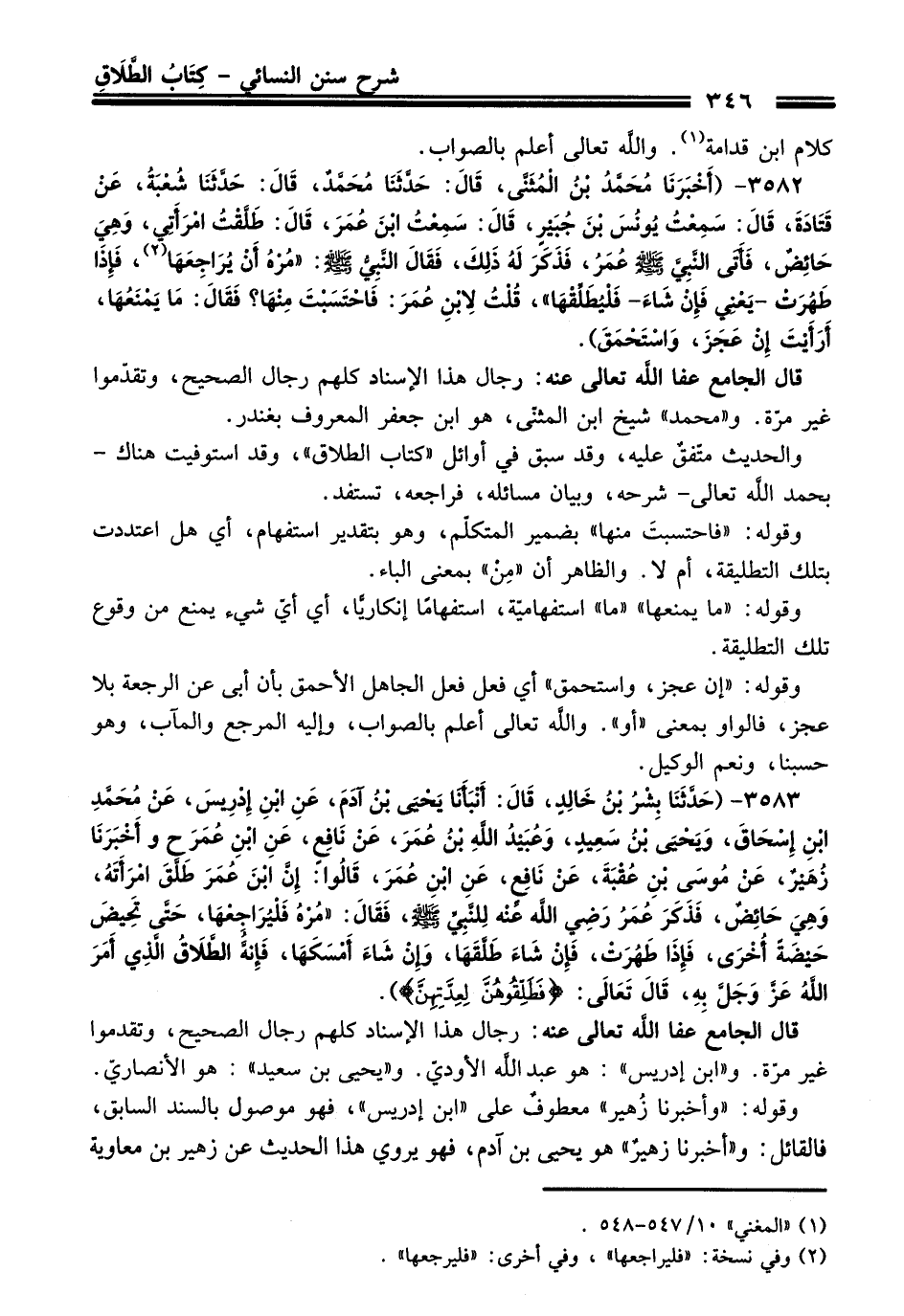3583 - حَدَّثَنَا بِشْرُ بْنُ خَالِدٍ, قَالَ: حَدَّثَنَا يَحْيَى بْنُ آدَمَ, عَنِ ابْنِ إِدْرِيسَ, عَنْ مُحَمَّدِ بْنِ إِسْحَاقَ, وَيَحْيَى بْنِ سَعِيدٍ, وَعُبَيْدِ اللَّهِ بْنِ عُمَرَ, عَنْ نَافِعٍ, عَنِ ابْنِ عُمَرَ ح وَأَخْبَرَنَا زُهَيْرٌ, عَنْ مُوسَى بْنِ عُقْبَةَ, عَنْ نَافِعٍ, عَنِ ابْنِ عُمَرَ, قَالُوا: إِنَّ ابْنَ عُمَرَ طَلَّقَ امْرَأَتَهُ, وَهِيَ حَائِضٌ, فَذَكَرَ عُمَرُ - رضي اللَّه عنه - لِلنَّبِيِّ - صلى اللَّه عليه وسلم -, فَقَالَ: «مُرْهُ فَلْيُرَاجِعْهَا, حَتَّى تَحِيضَ حَيْضَةً أُخْرَى, فَإِذَا طَهُرَتْ, فَإِنْ شَاءَ طَلَّقَهَا, وَإِنْ شَاءَ أَمْسَكَهَا, فَإِنَّهُ الطَّلاَقُ الَّذِي أَمَرَ اللَّهُ -عَزَّ وَجَلَّ- بِهِ, قَالَ تَعَالَى: {فَطَلِّقُوهُنَّ لِعِدَّتِهِنَّ}).
