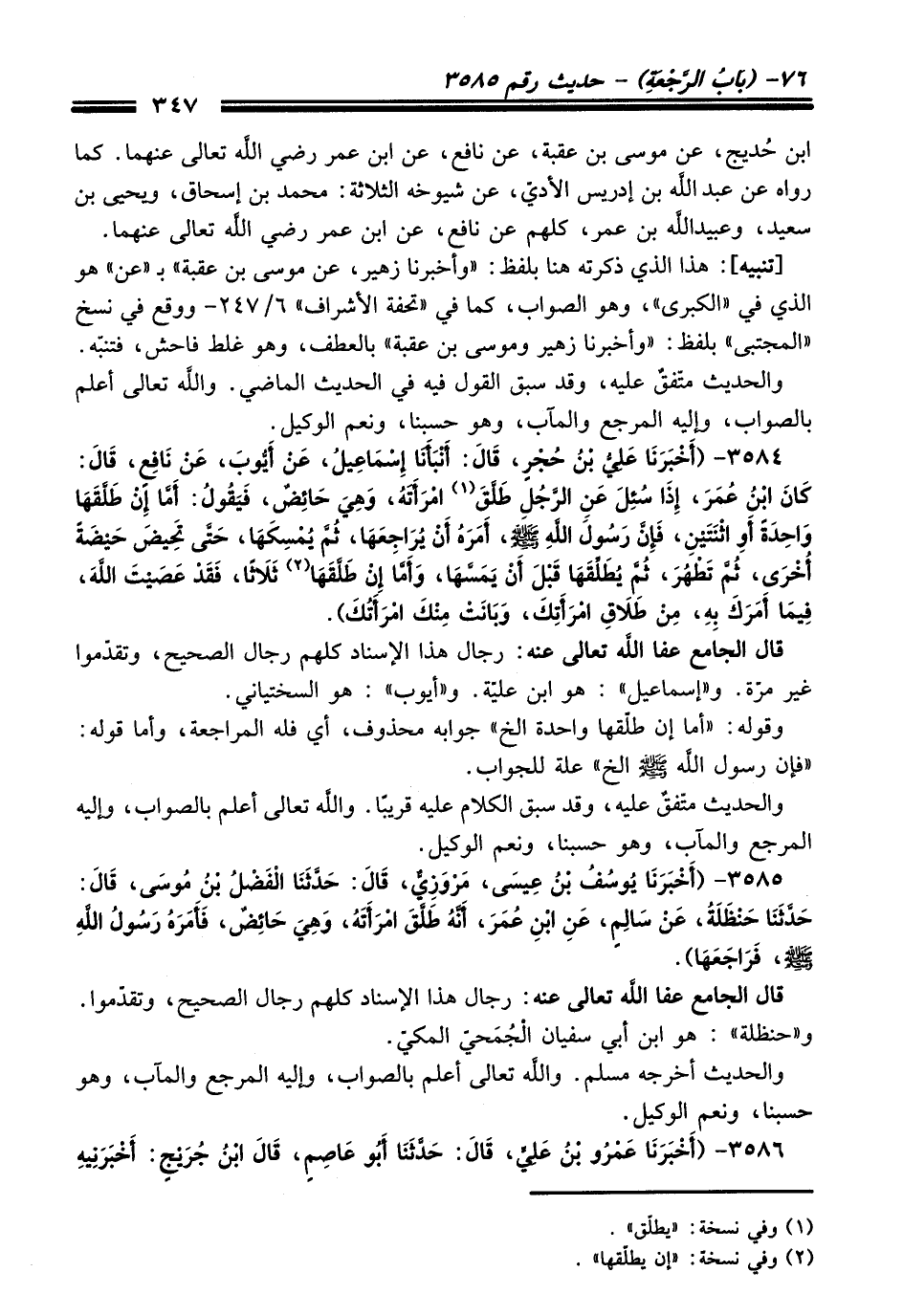3585 - (أَخْبَرَنَا يُوسُفُ بْنُ عِيسَى, مَرْوَزِيٌّ, قَالَ: حَدَّثَنَا الْفَضْلُ بْنُ مُوسَى, قَالَ: حَدَّثَنَا حَنْظَلَةُ, عَنْ سَالِمٍ, عَنِ ابْنِ عُمَرَ, أَنَّهُ طَلَّقَ امْرَأَتَهُ, وَهِيَ حَائِضٌ, فَأَمَرَهُ رَسُولُ اللهِ - صلى اللَّه عليه وسلم -, فَرَاجَعَهَا).