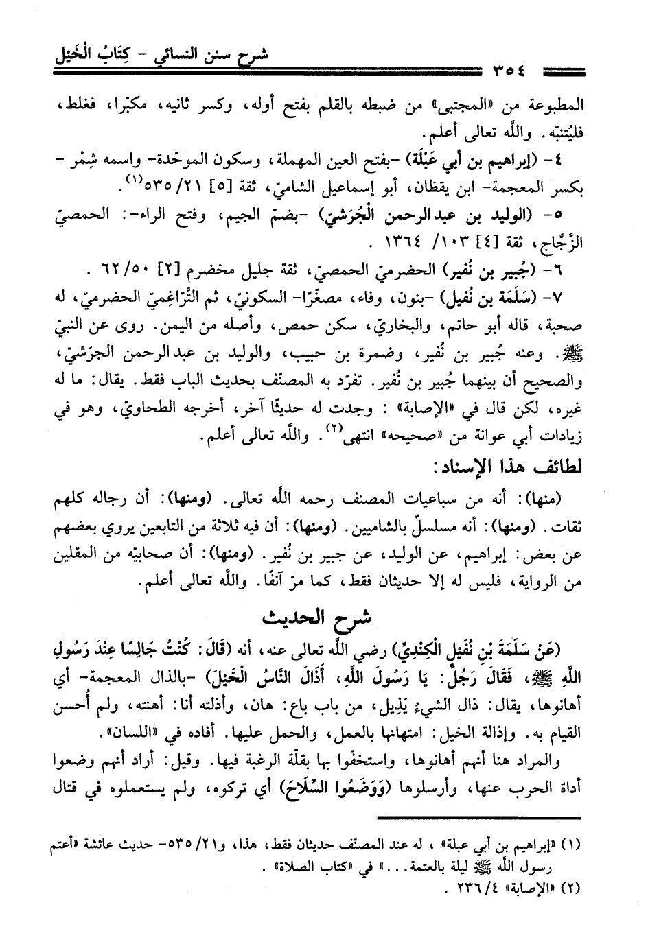 7 - (سلمة بن نُفيل) -بنون، وفاء، مصغّرًا- السكونيّ، ثم التَّرّاغِميّ الحضرميّ، له صحبة، قاله أبو حاتم، والبخاريّ، سكن حمص، وأصله من اليمن. روى عن النبيّ - صلى اللَّه عليه وسلم -. وعنه جُبير بن نُفير، وضمرة بن حبيب، والوليد بن عبد الرحمن الجرَشيّ، والصحيح أن بينهما جُبير بن نُفير. تفرّد به المصنّف بحديث الباب فقط. يقال: ما له غيره، لكن قال في "الإصابة": وجدت له حديثًا آخر، أخرجه الطحاويّ، وهو في زيادات أبي عوانة من "صحيحه" انتهى (¬2). واللَّه تعالى أعلم.