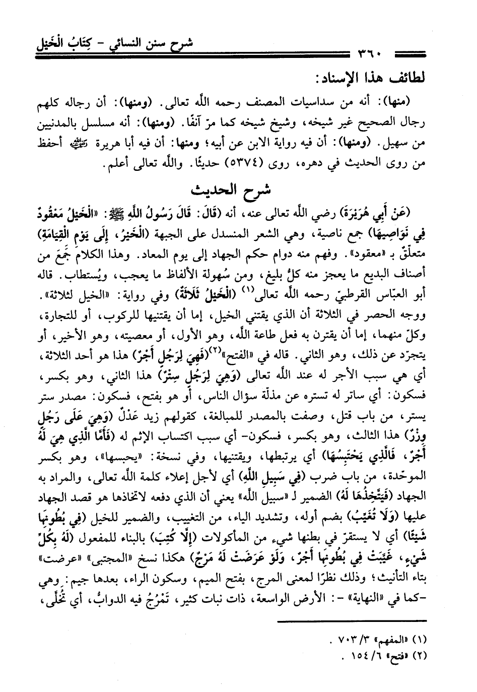 (عَنْ أَبِي هُرَيْرَةَ) - رضي اللَّه تعالى عنه -، أنه (قَالَ: قَالَ رَسُولُ اللهِ - صلى اللَّه عليه وسلم -: "الْخَيْلُ مَعْقُودٌ فِي نَوَاصِيهَا" جمع ناصية، وهي الشعر المنسدل على الجبهة (الْخَيْرُ إِلَى يَوْمِ الْقِيَامَةِ) متعلّقٌ بـ "معقود". وفهم منه دوام حكم الجهاد إلى يوم المعاد. وهذا الكلام جَمَعَ من أصناف البديع ما يعجز منه كلُّ بليغ، ومن سُهولة الألفاظ ما يعجب، ويُستطاب. قاله أبو العبّاس القرطبيّ -رحمه اللَّه تعالى- (¬1) (الْخَيْلُ ثَلاَثَةٌ) وفي رواية: "الخيل لثلاثة". ووجه الحصر في الثلاثة أن الذي يقتني الخيل، إما أن يقتنيها للركوب، أو للتجارة، وكلّ منهما، إما أن يقترن به فعل طاعة اللَّه، وهو الأول، أو معصيته، وهو الأخير، أو يتجرّد عن ذلك، وهو الثاني. قاله في "الفتح" (¬2) (فَهِيَ لِرَجُلٍ أَجْرٌ) هذا هو أحد الثلاثة، أي هي سبب الأجر له عند اللَّه تعالى (وَهِيَ لِرَجُلٍ سَتْرٌ) هذا الثاني، وهو بكسر، فسكون: أي ساتر له تستره عن مذلّة سؤال الناس، أو هو بفتح، فسكون: مصدر ستر يستر، من باب قتل، وصفت بالمصدر للمبالغة، كقولهم زيد عَدْلٌ (وَهِيَ عَلَى رَجُلٍ وِزْرٌ) هذا الثالث، وهو بكسر، فسكون -أي سبب اكتساب الإثم له (فَأَمَّا الَّذِي هِيَ لَهُ أَجْرٌ, فَالَّذِى يَحْتَبِسُهَا) أي يرتبطها، ويقتنيها، وفي نسخة: "يحبسها"، وهو بكسر الموحّدة، من باب ضرب (فِي سَبِيلِ اللهِ) أي لأجل إعلاء كلمة اللَّه تعالى، والمراد به الجهاد (فَيَتَّخِذُهَا لَهُ) الضمير لـ"سبيل اللَّه" يعني أن الذي دفعه لاتخاذها هو قصد الجهاد عليها (وَلاَ تُغَيِّبُ) بضمّ أوله، وتشديد الياء، من التغييب، والضمير للخيل (فِي بُطُونِهَا شَيْئًا) أي لا يستقرّ في بطنها شيء من المأكولات (إِلاَّ كُتِبَ) بالبناء للمفعول (لَهُ بِكُلِّ شَيْءٍ غَيَّبَتْ فِي بُطُونِهَا أَجْرٌ وَلَوْ عَرَضَتْ لَهُ مَرْجٌ) هكذا نسخ "المجتب" "عرضت" بتاء التأنيث؛ وذلك نظرًا لمعنى المرج، بفتح الميم، وسكون الراء، بعدها جيم: وهي -كما في "النهاية" -: الأرض الواسعة، ذات نبات كثير، تَمْرُجُ فيه الدوابُّ، أي تُخَلَّى،