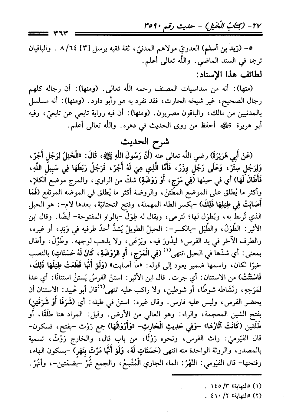 (عَنْ أَبِي هُرَيْرَةَ) - رضي اللَّه تعالى عنه - (أَنَّ رَسُولَ اللهِ - صلى اللَّه عليه وسلم -, قَالَ: «الْخَيْلُ لِرَجُلٍ أَجْرٌ, وَلِرَجُلٍ سَتْرٌ, وَعَلَى رَجُلٍ وِزْرٌ, فَأَمَّا الَّذِي هِيَ لَهُ أَجْرٌ, فَرَجُلٌ رَبَطَهَا فِي سَبِيلِ اللهِ, فَأَطَالَ لَهَا) أي في حبلها (فِي مَرْجٍ, أَوْ رَوْضَةٍ) شكّ من الراوي، والمرج موضع الكلإ، وأكثر ما يُطلق على الموضع المطئنّ، والروضة أكثر ما يُطلق في الموضه المرتفع (فَمَا أَصَابَتْ فِي طِيَلِهَا ذَلِكَ) -بكسر الطاء المهملة، وفيح التحتانيّة، بعدها لام-: هو الحبل الذي تُربط به، ويُطوّل لها؛ لترعى، ويقال له طِوَلٌ- بالواو المفتوحة- أيضًا. وقال ابن الأثير: الطِّوَلُ، والطِّيَل -بالكسر-: الحبلُ الطويلُ يُشدُّ أحدُ طرفيه في وَتِدٍ، أو غيره، والطرف الآخر في يد الفرس؛ ليدُور فيه، ويَرْعَى، ولا يذهب لوجهه. وطَوَّلَ، وأطال بمعنى: أي شدّها في الحبل انتهى (¬1) (فِي الْمَرْجِ أَوِ الرَّوْضَةِ كَانَ لَهُ حَسَنَاتٌ) بالنصب خبرًا لكان، واسمها ضمير يعود إلى قوله: "ما أصابت" (وَلَوْ أَنَّهَا قَطَعَتْ طِيَلَهَا ذَلِكَ فَاسْتَنَّتْ) من الاستنان: أي جرت. قال ابن الأثير: استنّ الفرسُ يَستنُّ استنانًا: أي عدا لمَرَحِهِ، ونشاطه شوطا، أو شوطين، ولا راكب عليه انتهى (¬2) قال أبو عُبيد: الاستنان أن يحضر الفرس، وليس عليه فارس. وقال غيره: استنّ في طيله: أي (شَرَفًا أَوْ شَرَفَيْنِ) بفتح الشين المعجمة، والراء: وهو العالي من الأرض. وقيل: المراد هنا طلَقًا، أو طلقين (كَانَتْ آثَارُهَا». وَفِي حَدِيثِ الْحَارِثِ «وَأَرْوَاثُهَا) جمع روث -بفتح، فسكون- قال الفيّوميّ: راث الفرس، ونحوه رَوْثًا، من باب قال، والخارج رَوْثٌ، تسمية بالمصدر، والروثة الواحدة منه انتهى (حَسَنَاتٍ لَهُ وَلَوْ أَنَّهَا مَرَّتْ بِنَهَرٍ) -بسكون الهاء، وفتحها- قال الفيّومي: النَّهْرُ: الماء الجاري الْمُتَّسِعُ، والجمع نُهُرٌ -بضمّتين-، وأنُهرٌ.