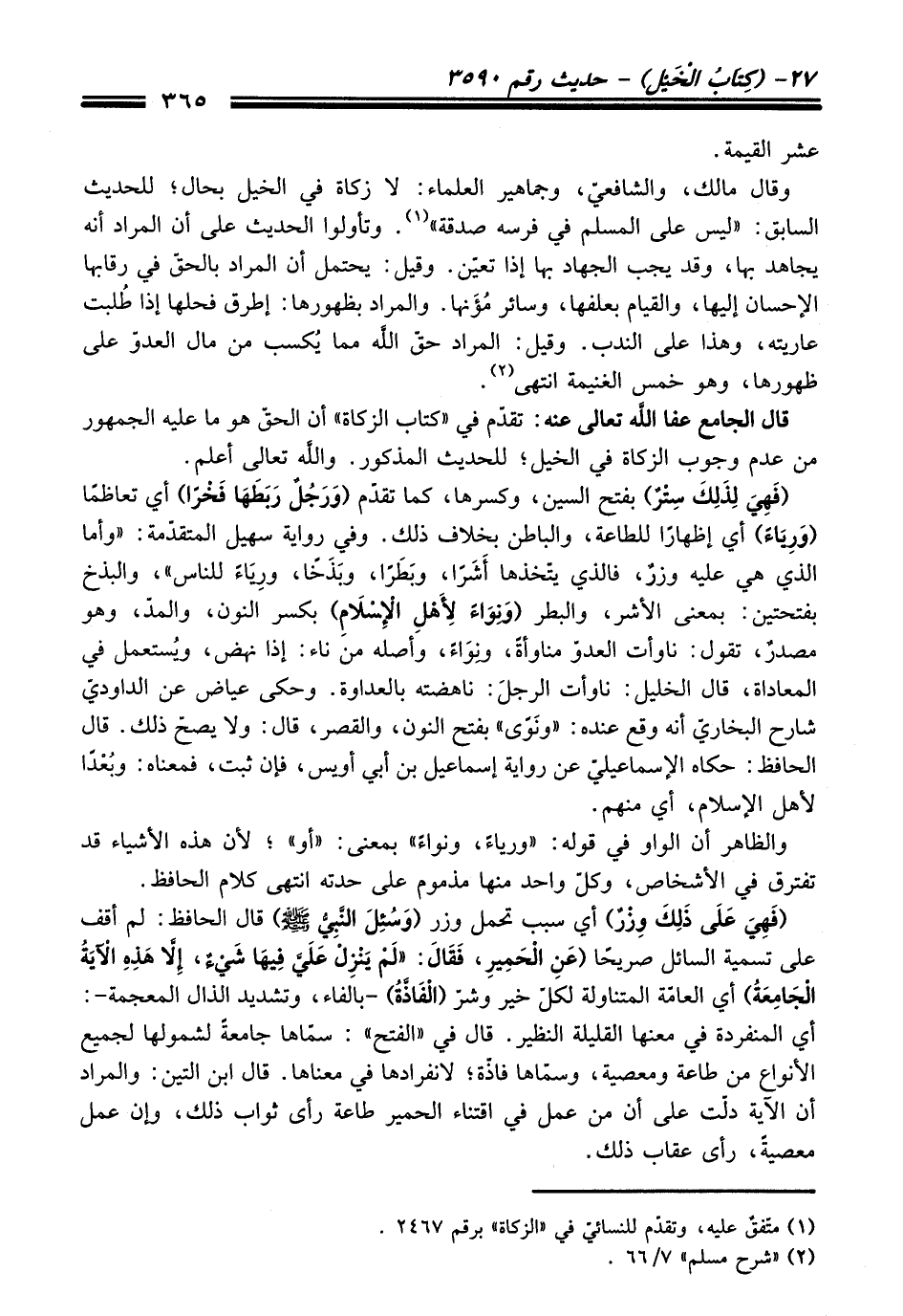 وقال مالك، والشافعيّ، وجماهير العلماء: لا زكاة في الخيل بحال؛ للحديث السابق: "ليس على المسلم في فرسه صدقة" (¬1). وتأولوا الحديث على أن المراد أنه يجاهد بها، وقد يجب الجهاد بها إذا تعيّن. وقيل: يحتمل أن المراد بالحقّ في رقابها الإحسان إليها، والقيام بعلفها، وسائر مُؤَنها. والمراد بظهورها: إطرق فحلها إذا طُلبت عاريته، وهذا على الندب. وقيل: المراد حقّ اللَّه مما يُكسب من مال العدوّ على ظهورها، وهو خمس الغنيمة انتهى (¬2).