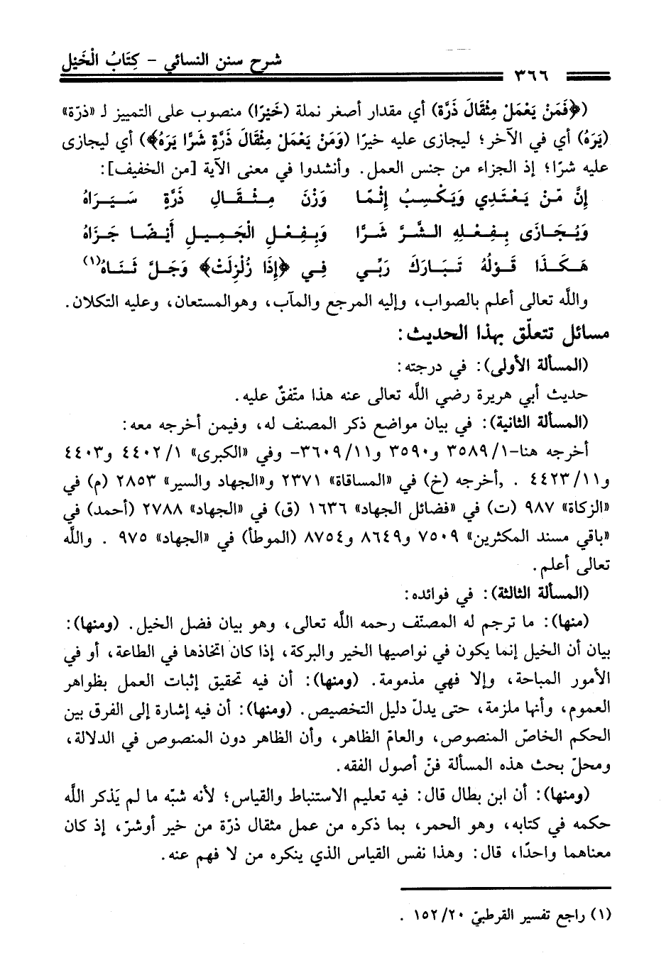 (ومنها): أن ابن بطال قال: فيه تعليم الاستنباط والقياس؛ لأنه شبّه ما لم يذكر اللَّه حكمه في كتابه، وهو الحمر، بما ذكره من عمل مثقال ذرّة من خير أو شرّ، إذ كان معناهما واحدًا، قال: وهذا نفس القياس الذي ينكره من لا فهم عنه.