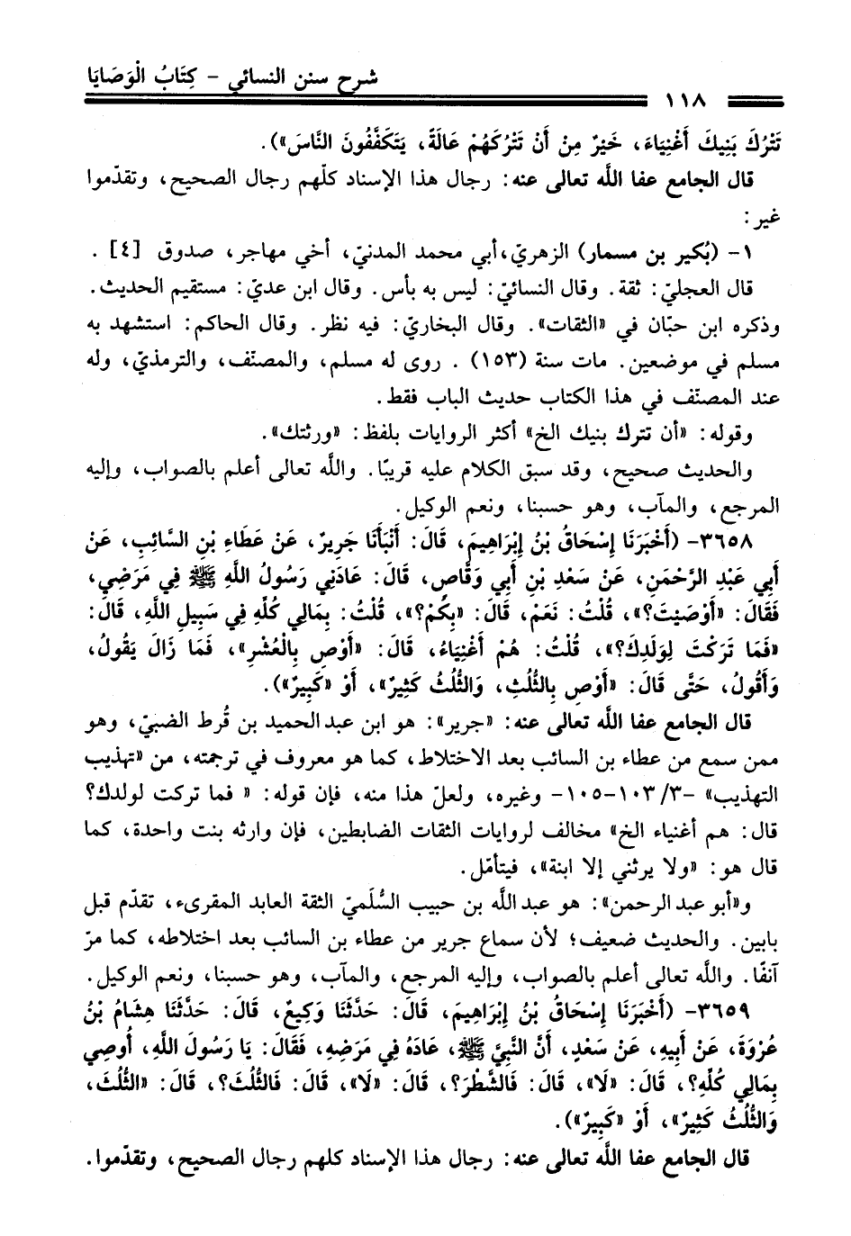 3658 - (أَخْبَرَنَا إِسْحَاقُ بْنُ إِبْرَاهِيمَ, قَالَ: أَنْبَأَنَا جَرِيرٌ, عَنْ عَطَاءِ بْنِ السَّائِبِ, عَنْ أَبِي عَبْدِ الرَّحْمَنِ, عَنْ سَعْدِ بْنِ أَبِي وَقَّاصٍ, قَالَ: عَادَنِي رَسُولُ اللهِ - صلى اللَّه عليه وسلم - فِي مَرَضِي, فَقَالَ: «أَوْصَيْتَ؟» , قُلْتُ: نَعَمْ, قَالَ: «بِكَمْ؟» , قُلْتُ: بِمَالِي كُلِّهِ فِي سَبِيلِ اللهِ, قَالَ: «فَمَا تَرَكْتَ لِوَلدِكَ؟» , قُلْتُ: هُمْ أَغْنِيَاءُ, قَالَ: «أَوْصِ بِالْعُشْرِ» , فَمَا زَالَ يَقُولُ, وَأَقُولُ, حَتَّى قَالَ: «أَوْصِ بِالثُّلُثِ, وَالثُّلُثُ كَثِيرٌ, أَوْ كَبِيرٌ»).