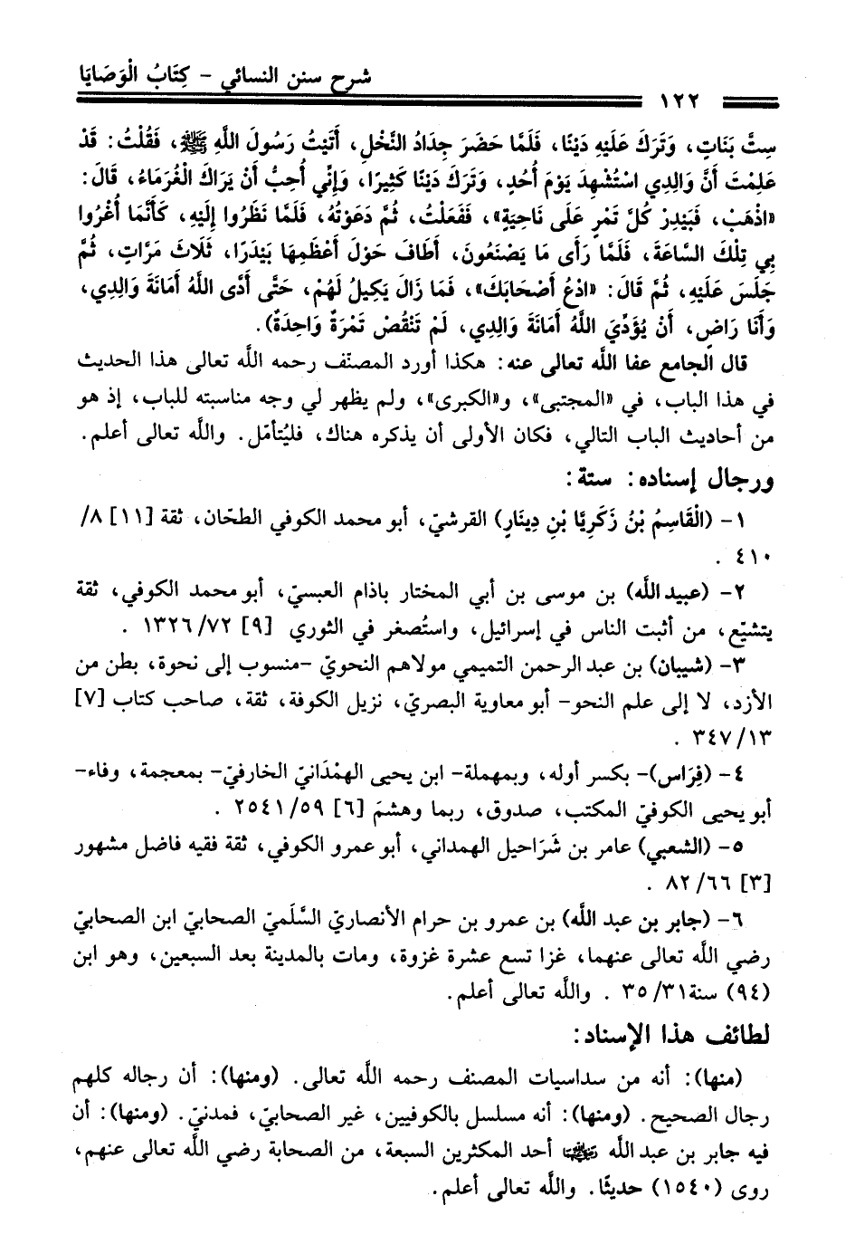 (منها): أنه من سداسيات المصنف -رحمه اللَّه تعالى-. (ومنها): أن رجاله كلهم رجال الصحيح. (ومنها): أنه مسلسل بالكوفيين، غير الصحابيّ، فمدنيّ. (ومنها): أن فيه جابر بن عبد اللَّه - رضي اللَّه عنهما - أحد المكثرين السبعة، من الصحابة - رضي اللَّه تعالى عنهم -، روى (1540) حديثًا. واللَّه تعالى أعلم.