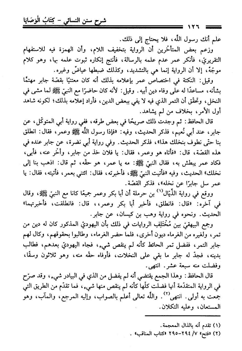 قال الحافظ: ثم وجدت ذلك صريحًا في بعض طرقه، ففي رواية أبي المتوكّل، عن جابر، عند أبي نُعيم، فذكر الحديث، وفيه: "فإذا رسول اللَّه - صلى اللَّه عليه وسلم - وعمر، فقال: انطلق بنا حتى نطوف بنخلك هذا"، فذكر الحديث. وفي رواية أبي نضرة، عن جابر عنده في هذه القصّة، قال: "فأتاه هو وعمر، فقال: يا فلان خذ من جابر، وأخّر عنه، فأبى، فكاد عمر يبطش به، فقال النبيّ - صلى اللَّه عليه وسلم -: مه يا عمر، هو حقّه، ثم قال: اذهب بنا إلى نخلك " الحديث، وفيه "فأتيت النبيّ - صلى اللَّه عليه وسلم -، فأخبرته، فقال: ائتني بعمر، فأتيته، فقال: يا عمر سل جابرًا عن نخله"، فذكر القصّة.