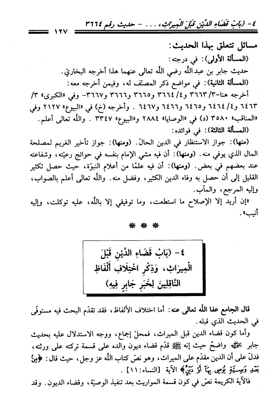 4 - (بَابُ قَضَاءِ الدَّينِ قَبْلَ الْمِيرَاثِ، وَذِكْرِ اخْتِلَافِ أَلْفَاظِ النَّاقِلِينَ لِخَبَرِ جَابِرٍ فِيهِ)