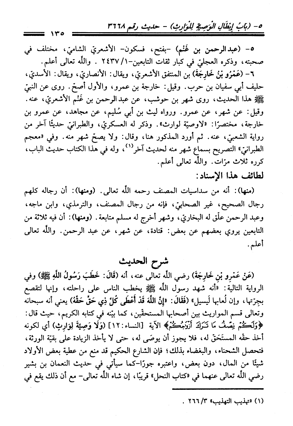 6 - (عَمْرُو بْنُ خَارِجَةَ) بن المنتفق الأشعريّ، ويقال: الأنصاريّ، ويقال: الأسديّ، حليف أبي سفيان بن حرب. وقيل: خارجة بن عمرو، والأول أصحّ. روى عن النبيّ - صلى اللَّه عليه وسلم - هذا الحديث، روى شهر بن حوشب، عن عبد الرحمن بن غَنْم الأشعريّ، عنه. وقيل: عن شهر، عن عمرو. ورواه ليث بن أبي سُليم، عن مجاهد، عن عمرو بن خارجة، مختصرًا: "لا وصيّة لوارث". وذكر له العسكريّ، والطبرانيّ حديثًا آخر من رواية الشعبيّ، عنه. ثم أورد المذكور هنا، وقال: ولا يصحّ شهر منه. وفي "معجم الطبرانيّ" التصريح بسماع شهر منه لحديث آخر (¬1)، وله في هذا الكتاب حديث الباب، كرره ثلاث مرّات. واللَّه تعالى أعلم.