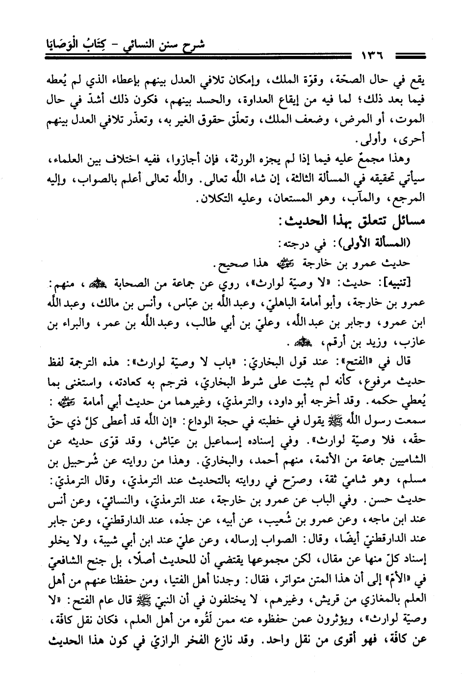 قال في "الفتح": عند قول البخاريّ: "باب لا وصيّة لوارث": هذه الترجمة لفظ حديث مرفوع، كأنه لم يثبت على شرط البخاريّ، فترجم به كعادته، واستغنى بما يُعطي حكمه. وقد أخرجه أبو داود، والترمذيّ، وغيرهما من حديث أبي أمامة - صلى اللَّه عليه وسلم -: سمعت رسول اللَّه - صلى اللَّه عليه وسلم - يقول في خطبته في حجة الوداع: "إن اللَّه قد أعطى كلَّ ذي حقّ حقّه، فلا وصيّة لوارث". وفي إسناده إسماعيل بن عياش، وقد قوّى حديثه عن الشاميين جماعة من الأئمة، منهم أحمد، والبخارقي. وهذا من روايته عن شُرحبيل بن مسلم، وهو شاميّ ثقة، وصرّح في روايته بالتحديث عند الترمذيّ، وقال الترمذيّ: حديث حسن. وفي الباب عن عمرو بن خارجة، عند الترمذيّ، والنسائيّ، وعن أنس عند ابن ماجه، وعن عمرو بن شُعيب، عن أبيه، عن جدّه، عند الدارقطنيّ، وعن جابر عند الدارقطنيّ أيضًا، وقال: الصواب إرساله، وعن عليّ عند ابن أبي شيبة، ولا يخلو إسناد كلّ منها عن مقال، لكن مجموعها يقتضي أن للحديث أصلاً، بل جنح الشافعيّ في "الأمّ" إلى أن هذا المتن متواتر، فقال: وجدنا أهل الفتيا، ومن حفظنا عنهم من أهل العلم بالمغازي من قريش، وغيرهم، لا يختلفون في أن النبيّ - صلى اللَّه عليه وسلم - قال عام الفتح: "لا وصيّة لوارث"، ويؤثرون عمن حفظوه عنه ممن لَقُوه من أهل العلم، فكان نقل كافّة، عن كافّة، فهو أقوى من نقل واحد. وقد نازع الفخر الرازيّ في كون هذا الحديث