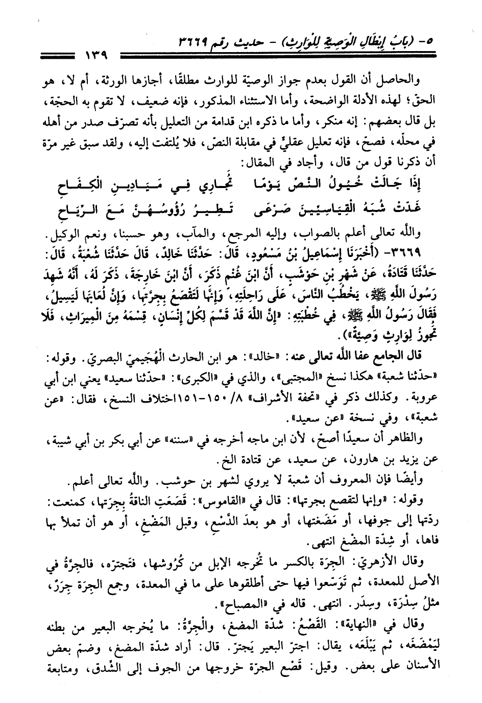 3669 - (أَخْبَرَنَا إِسْمَاعِيلُ بْنُ مَسْعُودٍ, قَالَ: حَدَّثَنَا خَالِدٌ, قَالَ: حَدَّثَنَا شُعْبَةُ, قَالَ: حَدَّثَنَا قَتَادَةُ, عَنْ شَهْرِ بْنِ حَوْشَبٍ, أَنَّ ابْنَ غَنْمٍ ذَكَرَ, أَنَّ ابْنَ خَارِجَةَ, ذَكَرَ لَهُ, أَنَّهُ شَهِدَ رَسُولَ اللهِ - صلى اللَّه عليه وسلم -, يَخْطُبُ النَّاسَ, عَلَى رَاحِلَتِهِ, وَإِنَّهَا لَتَقْصَعُ بِجِرَّتِهَا, وَإِنَّ لُعَابَهَا لَيَسِيلُ, فَقَالَ رَسُولُ اللهِ - صلى اللَّه عليه وسلم -, فِي خُطْبَتِهِ: «إِنَّ اللَّهَ قَدْ قَسَّمَ لِكُلِّ إِنْسَانٍ, قِسْمَهُ مِنَ الْمِيرَاثِ, فَلاَ تَجُوزُ لِوَارِثٍ وَصِيَّةٌ»).