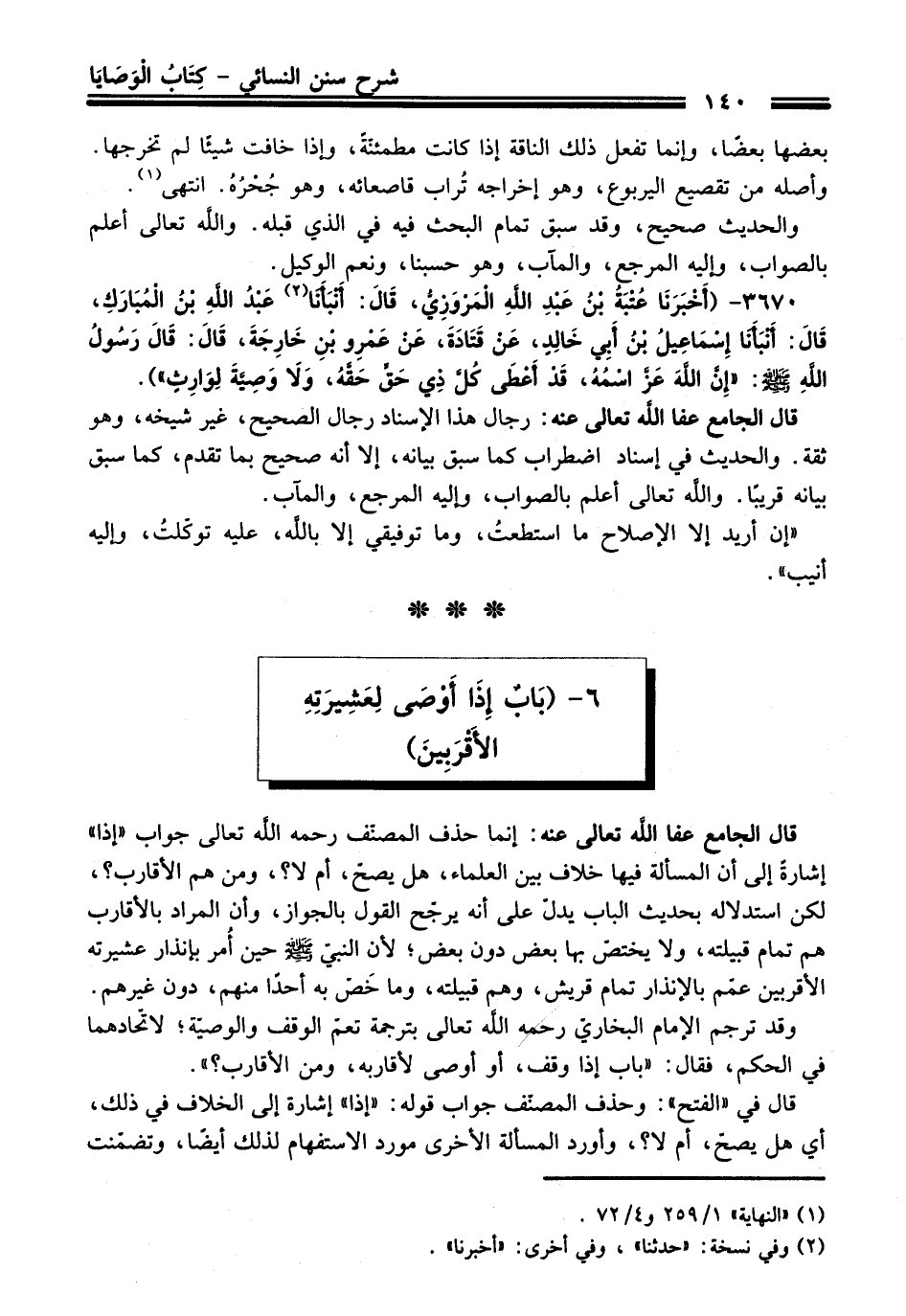 3670 - (أَخْبَرَنَا عُتْبَةُ بْنُ عَبْدِ اللَّهِ الْمَرْوَزِيُّ, قَالَ: أَنْبَأَنَا (¬2) عَبْدُ اللَّهِ بْنُ الْمُبَارَكِ, قَالَ: أَنْبَأَنَا إِسْمَاعِيلُ بْنُ أَبِي خَالِدٍ, عَنْ قَتَادَةَ, عَنْ عَمْرِو بْنِ خَارِجَةَ, قَالَ: قَالَ رَسُولُ اللهِ - صلى اللَّه عليه وسلم -: «إِنَّ اللَّهَ عَزَّ اسْمُهُ, قَدْ أَعْطَى كُلَّ ذِي حَقٍّ حَقَّهُ, وَلاَ وَصِيَّةَ لِوَارِثٍ»).