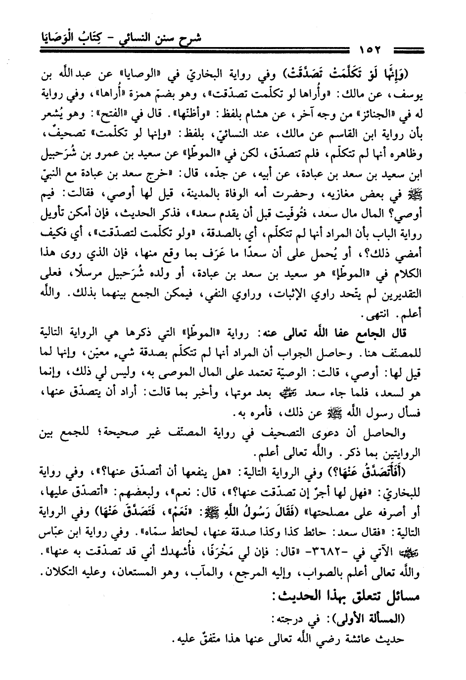 قال الجامع - عفا اللَّه تعالى عنه -: رواية "الموطّإ" التي ذكرها هي الرواية التالية للمصنّف هنا. وحاصل الجواب أن المراد أنها لم تتكلّم بصدقة شيء معيّن، وإنها لما قيل لها: أوصي، قالت: الوصيّة تعتمد على المال الموصى به، وليس لي ذلك، وإنما هو لسعد، فلما جاء سعد - رضي اللَّه عنه - بعد موتها، وأخبر بما قالت: أراد أن يتصدّق عنها، فسأل رسول اللَّه - صلى اللَّه عليه وسلم - عن ذلك، فأمره به.
