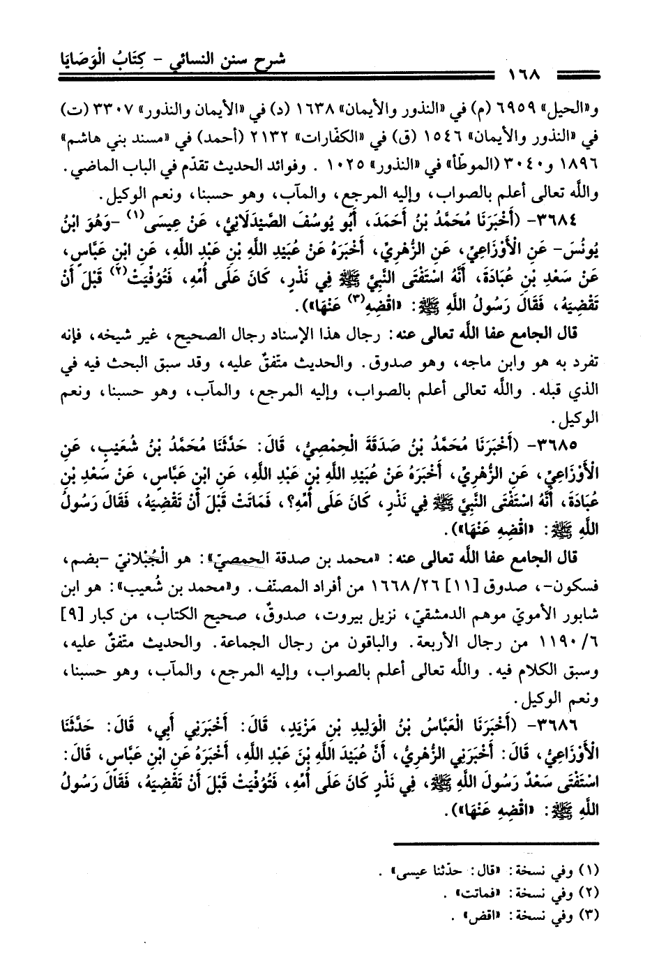 3684 - (أَخْبَرَنَا مُحَمَّدُ بْنُ أَحْمَدَ, أَبُو يُوسُفَ الصَّيْدَلاَنِيُّ, عَنْ عِيسَى (¬1) -وَهُوَ ابْنُ يُونُسَ- عَنِ الأَوْزَاعِيِّ, عَنِ الزُّهْرِيِّ,,, أَخْبَرَهُ عَنْ عُبَيْدِ اللَّهِ بْنِ عَبْدِ اللَّهِ, عَنِ ابْنِ عَبَّاسٍ, عَنْ سَعْدِ بْنِ عُبَادَةَ, أَنَّهُ اسْتَفْتَى النَّبِيَّ - صلى اللَّه عليه وسلم - فِي نَذْرٍ, كَانَ عَلَى أُمِّهِ, فَتُوُفِّيَتْ (¬2) قَبْلَ أَنْ تَقْضِيَهُ, فَقَالَ: رَسُولُ اللهِ - صلى اللَّه عليه وسلم -: «اقْضِهِ (¬3) عَنْهَا»).