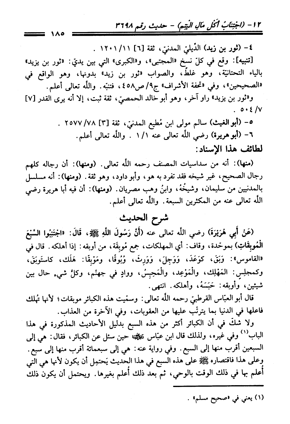 (عَنْ أَبِي هُرَيْرَةَ) - رضي اللَّه تعالى عنه - (أَنَّ رَسُولَ اللهِ - صلى اللَّه عليه وسلم -، قال: "اجْتَنِبُوا السَّبْعَ الْمُوبِقَاتِ) بموحّدة، وقاف: أي المهلكات، جمع مُوبِقّة، من أوبقه: إذا أهلكه. قال في "القاموس": وَبَقَ، كوَعَدَ، وَوَجِلَ، وَوَرِثَ، وُبُوقًا، ومّوْبِقًا: هَلَك، كاستَوبَقَ، وكمجلِسِ: المَهْلِك، والْموْعِد، والْمَحِبِسُ، ووادٍ في جهنّم، وكلُّ شيء حال بين شيئين، وأوبقه: حَبَسَهُ، وأهلكه. انتهى.