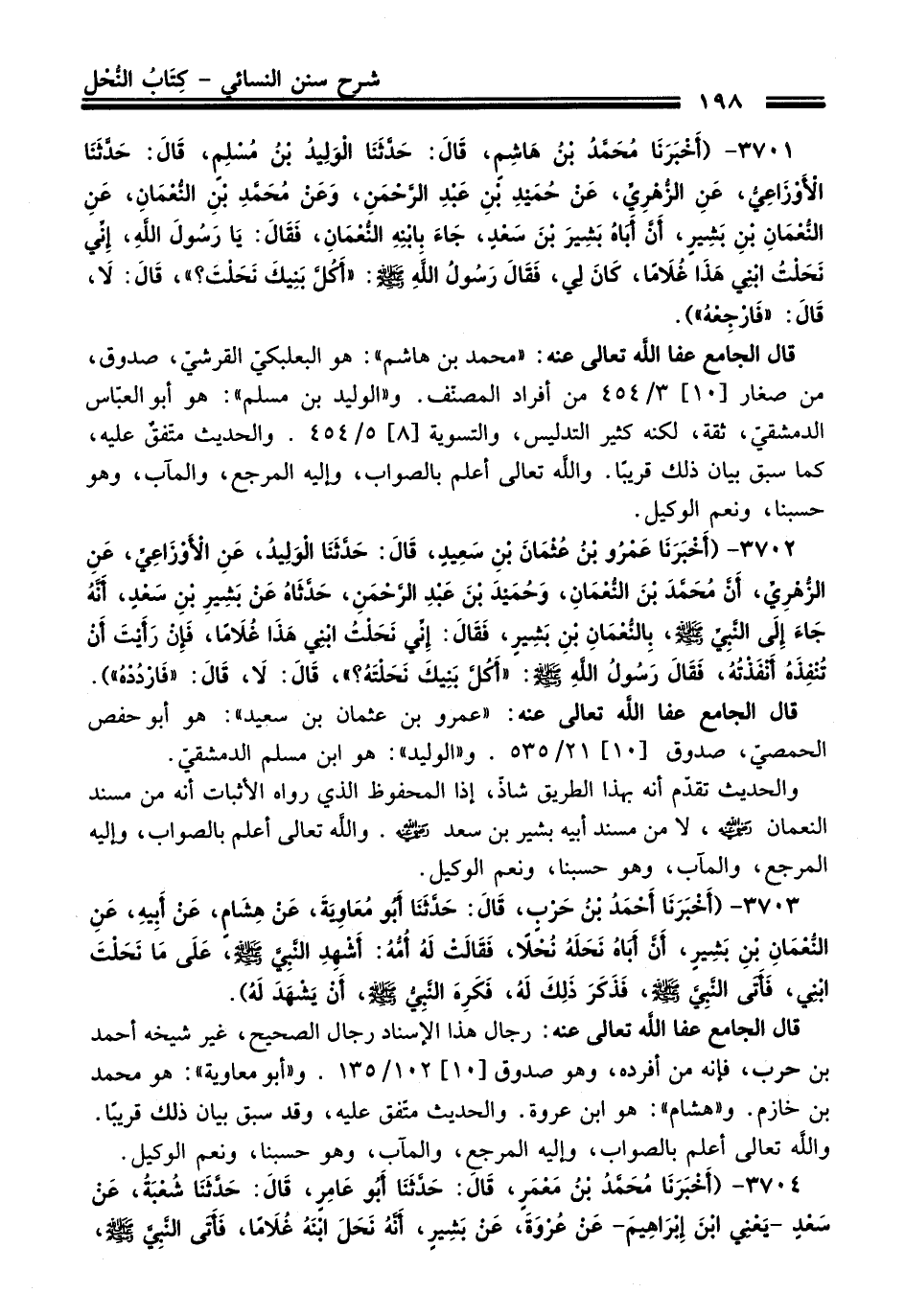 3701 - (أَخْبَرَنَا مُحَمَّدُ بْنُ هَاشِمٍ, قَالَ: حَدَّثَنَا الْوَلِيدُ بْنُ مُسْلِمٍ, قَالَ: حَدَّثَنَا الأَوْزَاعِيُّ, عَنِ الزُّهْرِيِّ, عَنْ حُمَيْدِ بْنِ عَبْدِ الرَّحْمَنِ, وَعَنْ مُحَمَّدِ بْنِ النُّعْمَانِ, عَنِ النُّعْمَانِ بْنِ بَشِيرٍ, أَنَّ أَبَاهُ بَشِيرَ بْنَ سَعْدٍ, جَاءَ بِابْنِهِ النُّعْمَانِ, فَقَالَ: يَا رَسُولَ اللهِ, إِنِّي نَحَلْتُ ابْنِي هَذَا غُلاَمًا, كَانَ لِي, فَقَالَ رَسُولُ اللهِ - صلى اللَّه عليه وسلم -: «أَكُلَّ بَنِيكَ نَحَلْتَ؟» , قَالَ: لاَ, قَالَ: «فَارْجِعْهُ»).