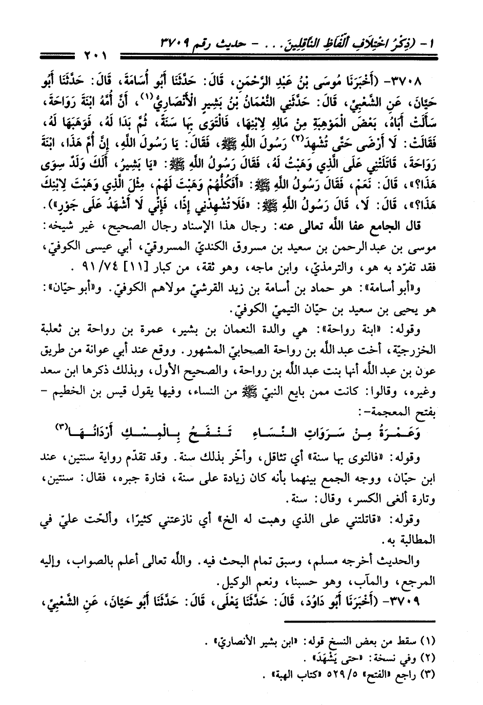 3708 - (أَخْبَرَنَا مُوسَى بْنُ عَبْدِ الرَّحْمَنِ, قَالَ: حَدَّثَنَا أَبُو أُسَامَةَ, قَالَ: حَدَّثَنَا أَبُو حَيَّانَ, عَنِ الشَّعْبِيِّ, قَالَ: حَدَّثَنِي النُّعْمَانُ بْنُ بَشِيرٍ الأَنْصَارِيُّ (¬1) , أَنَّ أُمَّهُ ابْنَةَ رَوَاحَةَ, سَأَلَتْ أَبَاهُ بَعْضَ الْمَوْهِبَةِ مِنْ مَالِهِ لاِبْنِهَا, فَالْتَوَى بِهَا سَنَةً, ثُمَّ بَدَا لَهُ, فَوَهَبَهَا لَهُ, فَقَالَتْ: لاَ أَرْضَى حَتَّى تُشْهِدَ (¬2) رَسُولَ اللهِ - صلى اللَّه عليه وسلم -, فَقَالَ: يَا رَسُولَ اللهِ, إِنَّ أُمَّ هَذَا, ابْنَةَ رَوَاحَةَ, قَاتَلَتْنِي عَلَى الَّذِي وَهَبْتُ لَهُ, فَقَالَ رَسُولُ اللهِ - صلى اللَّه عليه وسلم -: «يَا بَشِيرُ, أَلَكَ وَلَدٌ سِوَى هَذَا؟» , قَالَ: نَعَمْ, فَقَالَ رَسُولُ اللهِ - صلى اللَّه عليه وسلم -: «أَفَكُلُّهُمْ وَهَبْتَ لَهُمْ, مِثْلَ الَّذِي وَهَبْتَ لاِبْنِكَ هَذَا؟» , قَالَ: لاَ, قَالَ رَسُولُ اللهِ - صلى اللَّه عليه وسلم -: «فَلاَ تُشْهِدْنِي إِذًا, فَإِنِّي لاَ أَشْهَدُ عَلَى جَوْرٍ»).