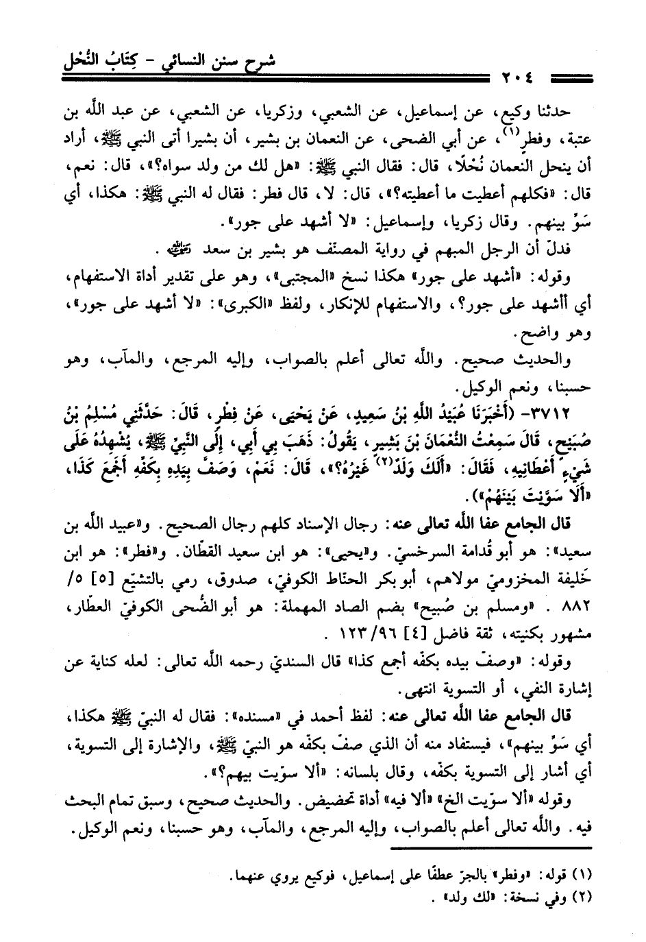 3712 - (أَخْبَرَنَا عُبَيْدُ اللَّهِ بْنُ سَعِيدٍ, عَنْ يَحْيَى, عَنْ فِطْرٍ, قَالَ: حَدَّثَنِي مُسْلِمُ بْنُ صُبَيْحٍ, قَالَ: سَمِعْتُ النُّعْمَانَ بْنَ بَشِيرٍ, يَقُولُ: ذَهَبَ بِي أَبِي, إِلَى النَّبِيِّ - صلى اللَّه عليه وسلم -, يُشْهِدُهُ عَلَى شَيْءٍ أَعْطَانِيهِ, فَقَالَ: «أَلَكَ وَلَدٌ (¬2) غَيْرُهُ؟» , قَالَ: نَعَمْ, وَصَفَّ بِيَدِهِ بِكَفِّهِ أَجْمَعَ كَذَا, "أَلاَ سَوَّيْتَ بَيْنَهُمْ").