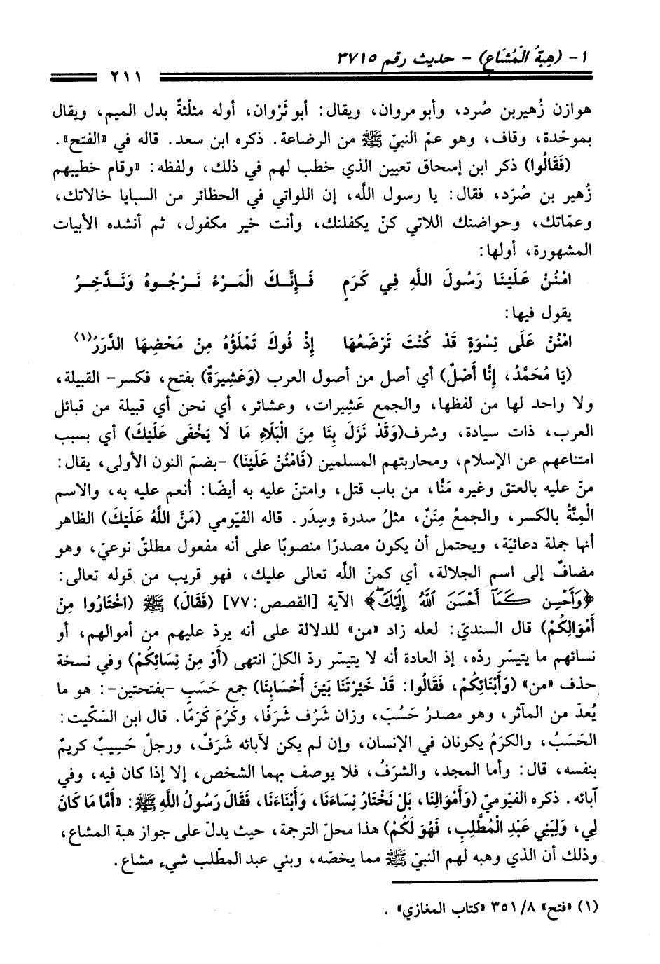 (يَا مُحَمَّدُ، إِنَّا أَصْلٌ) أي أصل من أصول العرب (وَعَشِيرَةٌ) بفتح، فكسر- القبيلة، ولا واحد لها من لفظها، والجمع عَشِيرات، وعشائر، أي نحن أي قبيلة من قبائل العرب، ذات سيادة، وشرف (وَقَدْ نَزَلَ بِنَا مِنَ الْبَلاَءِ مَا لاَ يَخْفَى عَلَيْكَ) أي بسبب امتناعهم عن الإسلام، ومحاربتهم المسلمين (فَامْنُنْ عَلَيْنَا) -بضمّ النون الأولى، يقال: منّ عليه بالعتق وغيره مَنَّا، من باب قتل، وامتنّ عليه به أيضًا: أنعم عليه به، والاسم الْمِنَّةُ بالكسر، والجمعُ مِنَنٌ، مثلُ سدرة وسِدَر. قاله الفيّومي (مَنَّ اللَّهُ عَلَيْكَ) الظاهر أنها جملة دعائيّة، ويحتمل أن يكون مصدرًا منصوبًا على أنه مفعول مطلقٌ نوعيّ، وهو مضافٌ إلى اسم الجلالة، أي كمنّ اللَّه تعالى عليك، فهو قريب من قوله تعالى: {وَأَحْسِنْ كَمَا أَحْسَنَ اللَّهُ إِلَيْكَ} الآية [القصص: 77] (فَقَالَ) - صلى اللَّه عليه وسلم - (اخْتَارُوا مِنْ أَمْوَالِكُمْ) قال السنديّ: لعله زاد "من" للدلالة على أنه يردّ عليهم من أموالهم، أو نسائهم ما يتيسّر ردّه، إذ العادة أنه لا يتيسّر ردّ الكلّ انتهى (أَوْ مِنْ نِسَائِكُمْ) وفي نسخة حذف "من" (وَأَبْنَائِكُمْ، فَقَالُوا: قَدُ خَيَّرتَنَا بَيْنَ أَحْسَابِنَا) جمع حَسَبٍ -بفتحتين-: هو ما يُعدّ من المآثر، وهو مصدرُ حَسُبَ، وزان شَرُف شَرَفًا، وكَرُمَ كَرَمًا. قال ابن السّكّيت: الحسبُ، والكرمُ يكونان في الإنسان، وإن لم يكن لآبائه شَرَفٌ، ورجلٌ حسِيبٌ كريمٌ بنفسه، قال: وأما المجد، والشرفُ، فلا يوصف بهما الشخص، إلا إذا كان فيه، وفي آبائه. ذكره الفيّوميّ (وَأَمْوَالِنَا، بَلْ نَخْتَارُ نِسَاءَنَا، وَأَبْنَاءَنَا، فَقَالَ رَسُولُ اللهِ - صلى اللَّه عليه وسلم -: "أمَّا مَا كَانَ لِي، وَلِبَنِي عَبْدِ الْمُطَّلِبِ، فهُو لكُمْ) هذا محلّ الترجمة، حيث يدلّ على جواز هبة المشاع، وذلك أن الذي وهبه لهم النبيّ - صلى اللَّه عليه وسلم - مما يخصّه، وبني عبد المطّلب شيء مشاع.