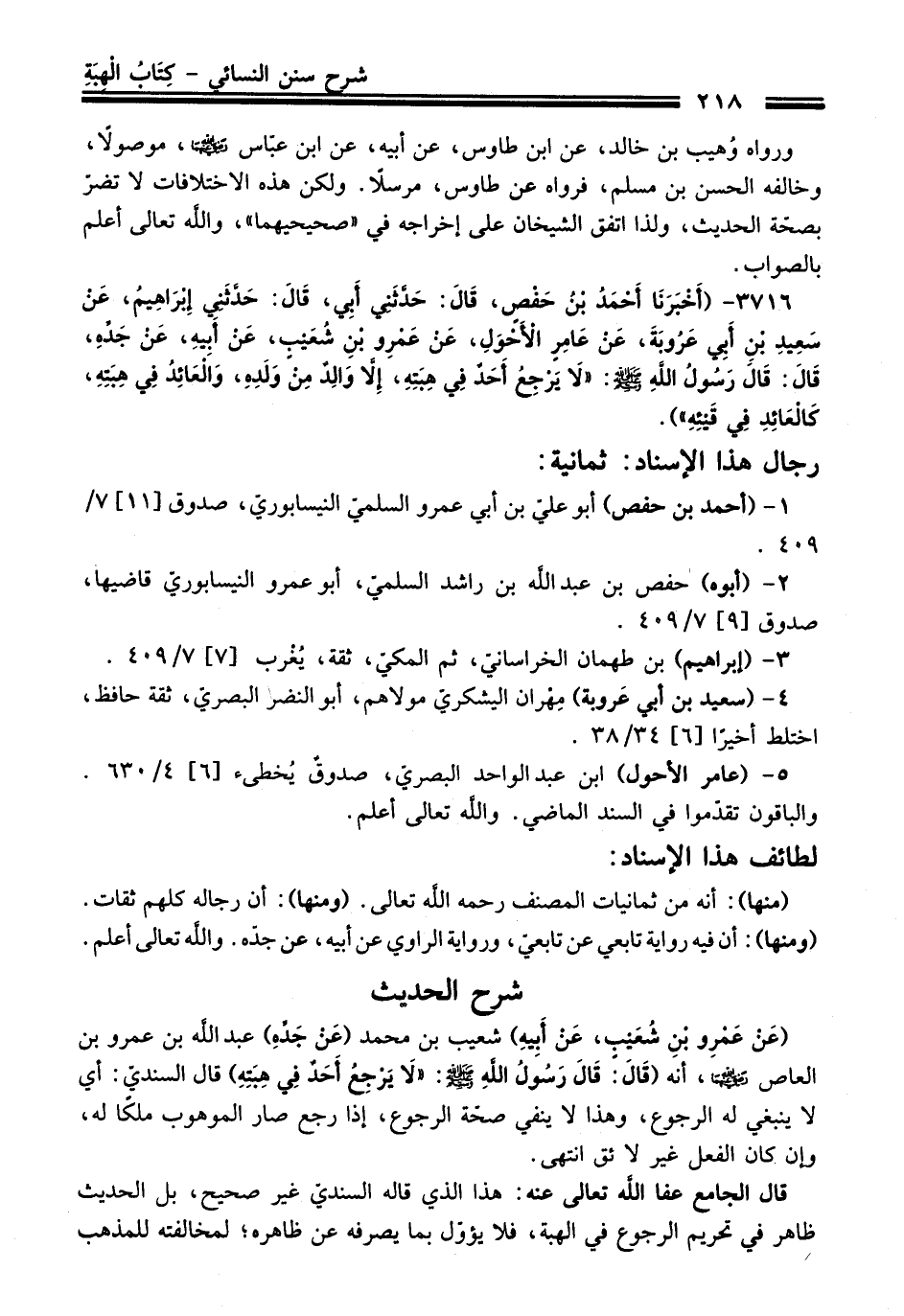 3716 - (أَخْبَرَنَا أَحْمَدُ بْنُ حَفْصٍ, قَالَ: حَدَّثَنِي أَبِي, قَالَ: حَدَّثَنِي إِبْرَاهِيمُ, عَنْ سَعِيدِ بْنِ أَبِي عَرُوبَةَ, عَنْ عَامِرٍ الأَحْوَلِ, عَنْ عَمْرِو بْنِ شُعَيْبٍ, عَنْ أَبِيهِ, عَنْ جَدِّهِ, قَالَ: قَالَ رَسُولُ اللهِ - صلى اللَّه عليه وسلم -: «لا يَرْجِعُ أَحَدٌ فِي هِبَتِهِ, إِلاَّ وَالِدٌ مِنْ وَلَدِهِ, وَالْعَائِدُ فِي هِبَتِهِ, كَالْعَائِدِ فِي قَيْئِهِ»).
