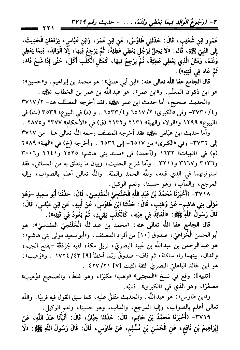 3718 - (أَخْبَرَنَا مُحَمَّدُ بْنُ عَبْدِ اللَّهِ الْخَلَنْجِيُّ الْمَقْدِسِيُّ, قَالَ: حَدَّثَنَا أَبُو سَعِيدٍ -وَهُوَ مَوْلَى بَنِي هَاشِمٍ- عَنْ وُهَيْبٍ, قَالَ: حَدَّثَنَا ابْنُ طَاوُسٍ, عَنْ أَبِيهِ, عَنِ ابْنِ عَبَّاسٍ, قَالَ: قَالَ: رَسُولُ اللهِ - صلى اللَّه عليه وسلم -: «الْعَائِدُ فِي هِبَتِهِ, كَالْكَلْبِ يَقِيءُ, ثُمَّ يَعُودُ فِي قَيْئِهِ»).