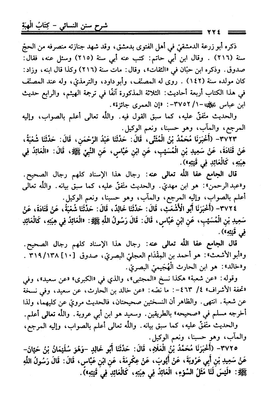 3724 - (أَخْبَرَنَا أَبُو الأَشْعَثِ, قَالَ: حَدَّثَنَا خَالِدٌ, قَالَ: حَدَّثَنَا شُعْبَةُ, عَنْ قَتَادَةَ, عَنْ سَعِيدِ بْنِ الْمُسَيَّبِ, عَنِ ابْنِ عَبَّاسٍ, قَالَ: قَالَ رَسُولُ اللهِ - صلى اللَّه عليه وسلم -: «الْعَائِدُ فِي هِبَتِهِ, كَالْعَائِدِ فِي قَيْئِهِ»).