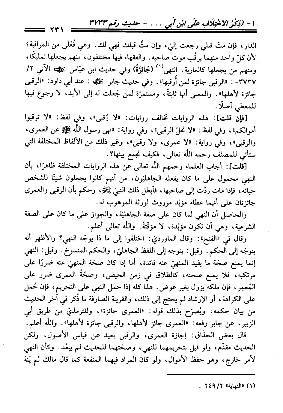 [قلت]: أجاب العلماء -رحمهم اللَّه تعالى- عن هذه الروايات المختلفة ظاهرًا، بأن النهي محمول على ما كان يفعله الجاهليّون، من أنهم كانوا يجعلون شيئًا للشخص حياته، فإذا مات ردّت إلى صاحبها، فأبطل ذلك النبيّ - صلى اللَّه عليه وسلم -، وحكم بأن الرقبى والعمرى جائزتان على أنهما عطاء مؤبّد موروث لورثة الموهوب له.