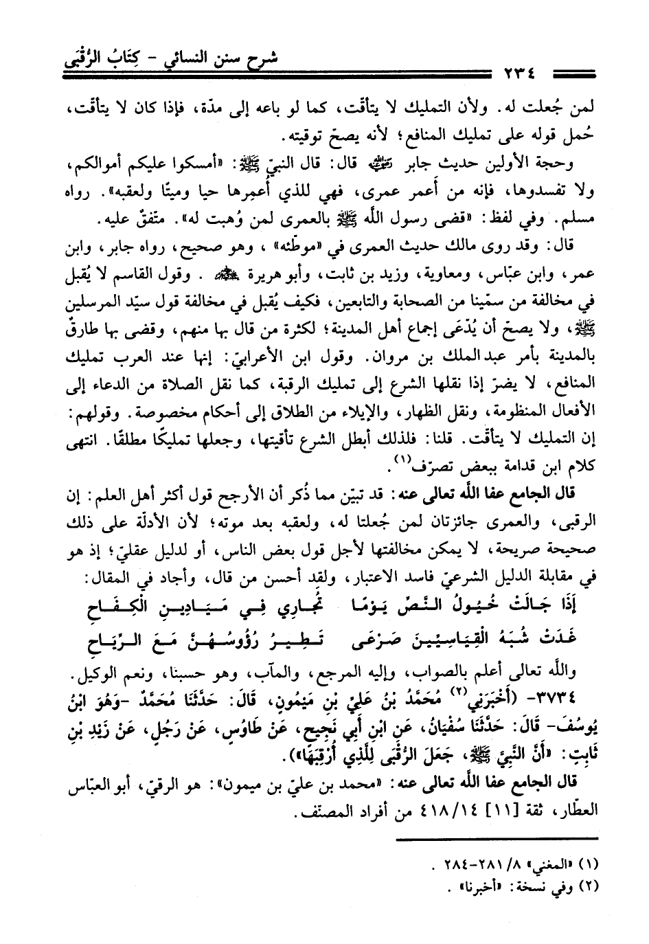 قال. وقد روى مالك حديث العمرى في "موطئه"، وهو صحيح، رواه جابر، وابن عمر، وابن عبّاس، ومعاوية، وزيد بن ثابت، وأبو هريرة - رضي اللَّه عنه -. وقول القاسم لا يُقبل في مخالفة من سمّينا من الصحابة والتابعين، فكيف يُقبل في مخالفة قول سيّد المرسليين - صلى اللَّه عليه وسلم -، ولا يصحّ أن يُدّعَى إجماع أهل المدينة؛ لكثرة من قال بها منهم، وقضى بها طارقٌ بالمدينة بأمر عبد الملك بن مروان. وقول ابن الأعرابيّ: إنها عند العرب تمليك المنافع، لا يضرّ إذا نقلها الشرع إلى تمليك الرقبة، كما نقل الصلاة من الدعاء إلى الأفعال المنظومة، ونقل الظهار، والإيلاء من الطلاق إلى أحكام مخصوصة. وقولهم: إن التمليك لا يتأقّت. قلنا: فلذلك أبطل الشرع تأقيتها، وجعلها تمليكًا مطلقًا. انتهى كلام ابن قدامة ببعض تصرّف (¬1).