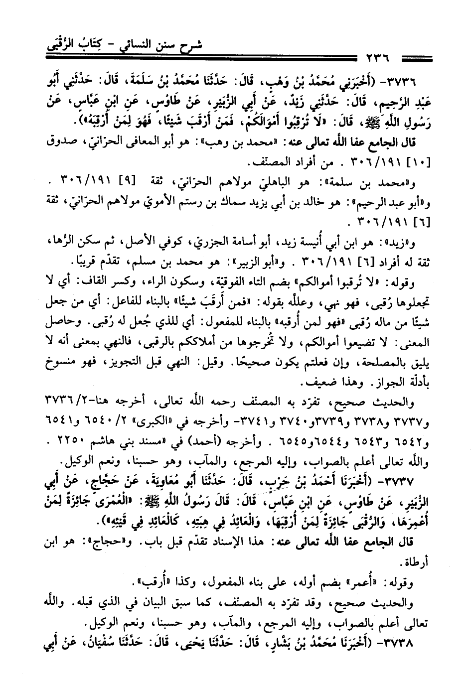 3736 - (أَخْبَرَنِي مُحَمَّدُ بْنُ وَهْبٍ, قَالَ: حَدَّثَنَا مُحَمَّدُ بْنُ سَلَمَةَ, قَالَ: حَدَّثَنِي أَبُو عَبْدِ الرَّحِيمِ, قَالَ: حَدَّثَنِي زَيْدٌ, عَنْ أَبِي الزُّبَيْرِ, عَنْ طَاوُسٍ, عَنِ ابْنِ عَبَّاسٍ, عَنْ رَسُولِ اللهِ - صلى اللَّه عليه وسلم -, قَالَ: «لاَ تُرْقِبُوا أَمْوَالَكُمْ, فَمَنْ أَرْقَبَ شَيْئًا, فَهُوَ لِمَنْ أُرْقِبَهُ»).