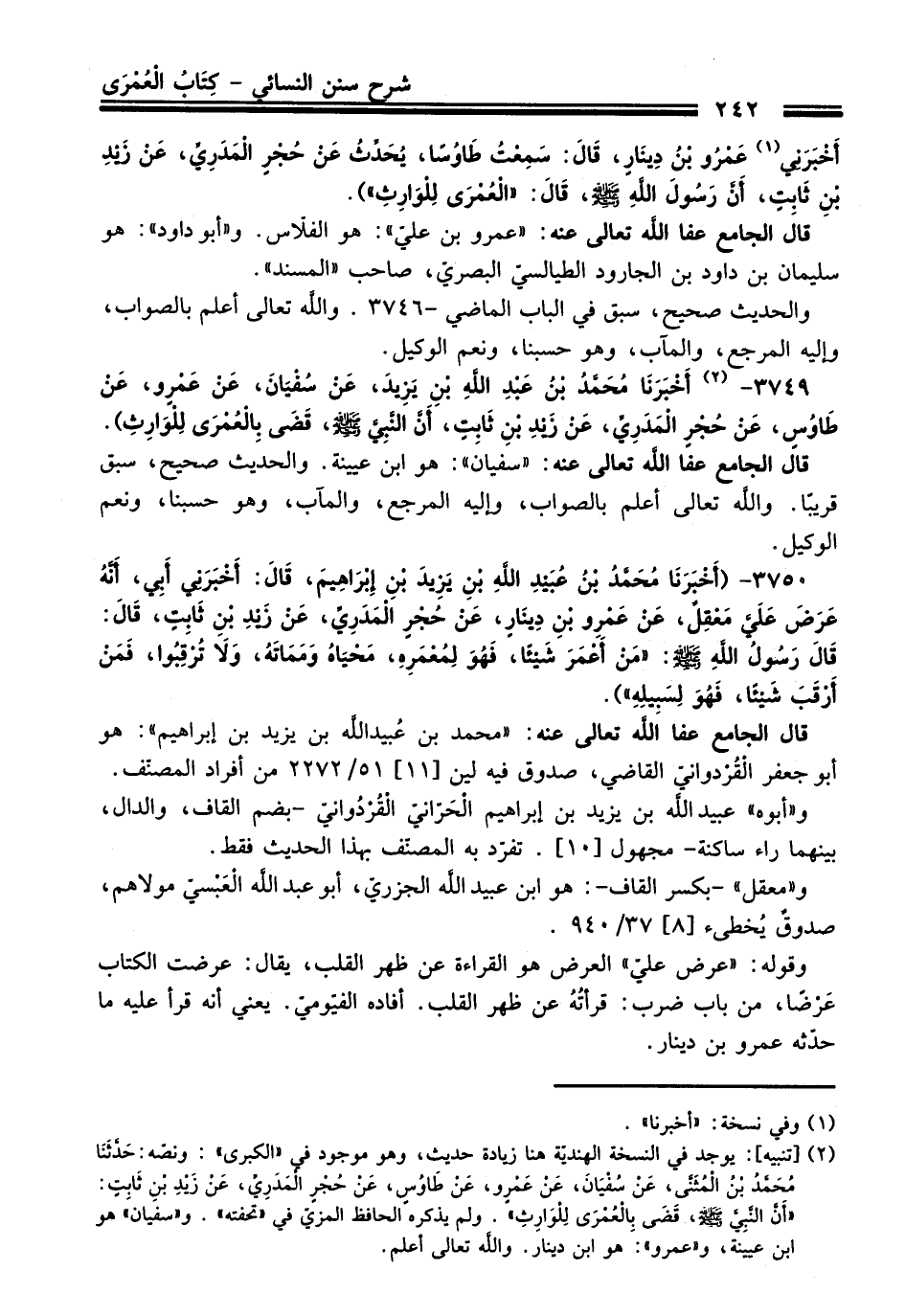 (¬2) [تنبيه]: يوجد في النسخة الهنديّة هنا زيادة حديث، وهو موجود في "الكبرى": ونصه: حَدَّثَنَا مُحَمَّدُ بْنُ الْمُثَنَّى، عَنْ سُفْيَانَ، عَنْ عَمْرٍو، عَنْ طَاوُسٍ، عَنْ حُجْرٍ الْمَدَرِيِّ، عَنْ زَيْدِ بْنِ ثَابِتٍ: "أَنَّ النَّبِيَّ - صلى اللَّه عليه وسلم -، قَضَى بِالْعُمْرَى لِلوَارِثِ". ولم يذكره الحافظ المزيّ في "تحفته". و"سفيان" هو ابن عيينة، و"عمرو": هو ابن دينار. واللَّه تعالى أعلم.