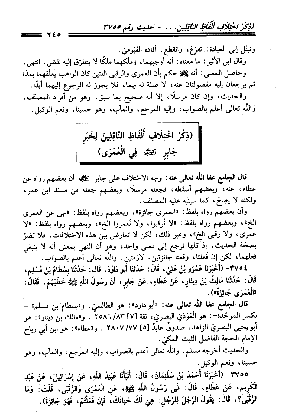 قال الجامع - عفا اللَّه تعالى عنه -: وجه الاختلاف على جابر - رضي اللَّه عنه - أن بعضهم رواه عن عطاء، عنه، وبعضهم أسقطه، فجعله مرسلاً، وبعضهم جعله من مسند ابن عمر، ولكنه لا يصحّ، كما سينبّه عليه المصنّف.
