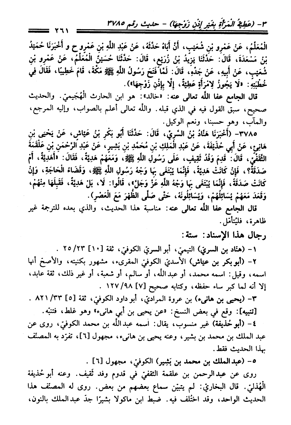 الْمُعَلِّمُ، عَنْ عَمْرِو بْنِ شُعَيْبٍ، أَنَّ أَبَاهُ، حَدَّثَهُ، عَنْ عَبْدِ اللَّهِ بْنِ عَمْرٍو ح وأَخْبَرَنَا حُمَيْدُ بْنُ مَسْعَدَةَ، قَالَ: حَدَّثَنَا يَزِيدُ بْنُ زُرَيْعٍ، قَالَ: حَدَّثَنَا حُسَيْنٌ الْمُعَلِّمُ، عَنْ عَمْرِو بْنِ شُعَيْبٍ، عَنْ أَبِيهِ، عَنْ جَدِّهِ، قَالَ: لَمَّا فَتَحَ رَسُولُ اللهِ - صَلَّى اللَّهُ عَلَيْهِ وَسَلَّمَ - مَكَّةَ, قَامَ خَطِيبًا, فَقَالَ فِي خُطْبَتِهِ: "لَا يَجُوزُ لِامْرَأَةٍ عَطِيَّةٌ إِلَّا بِإِذْنِ زَوْجِهَا").