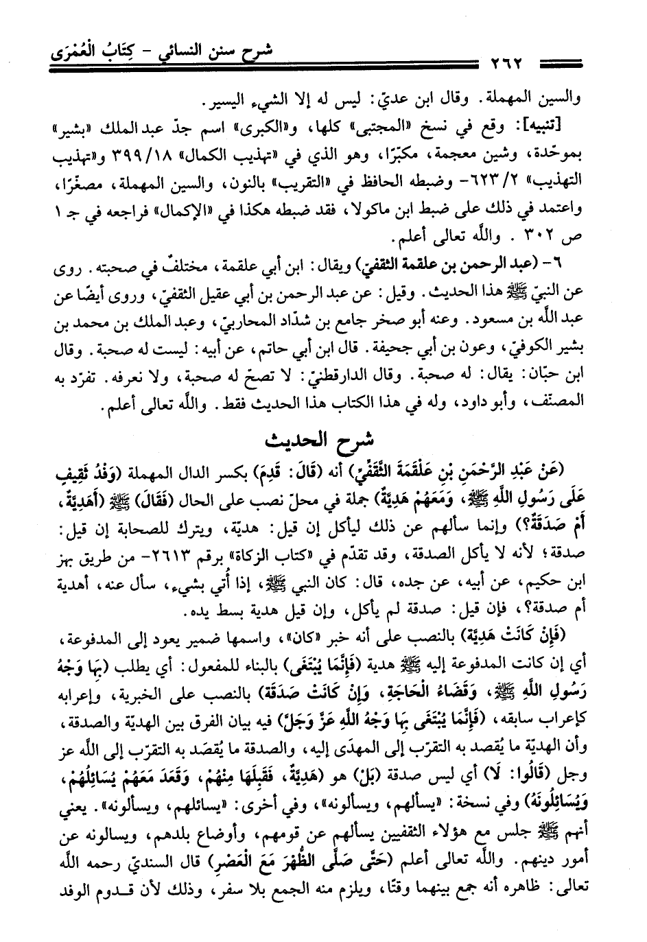 (عَنْ عَبْدِ الرَّحْمَنِ بْنِ عَلْقَمَةَ الثَّقَفِّيِّ) أنه (قَالَ: قَدِمَ) بكسر الدال المهملة (وَفْدُ ثَقِيفٍ عَلَى رَسُولِ اللهِ - صلى اللَّه عليه وسلم -، وَمَعَهُمْ هَدِيَّةٌ) جملة في محلّ نصب على الحال (فَقَالَ) - صلى اللَّه عليه وسلم - (أَهَدِيَّةٌ، أَمْ صَدَقَةٌ؟) وإنما سألهم عن ذلك ليأكل إن قيل: هديّة، ويترك للصحابة إن قيل. صدقة؛ لأنه لا يأكل الصدقة، وقد تقدّم في "كتاب الزكاة" برقم 2613 - من طريق بهز ابن حكيم، عن أبيه، عن جده، قال: كان النبي - صلى اللَّه عليه وسلم -، إذا أُتي بشيء، سأل عنه، أهدية أم صدقة؟، فإن قيل: صدقة لم يأكل، وإن قيل هدية بسط يده.