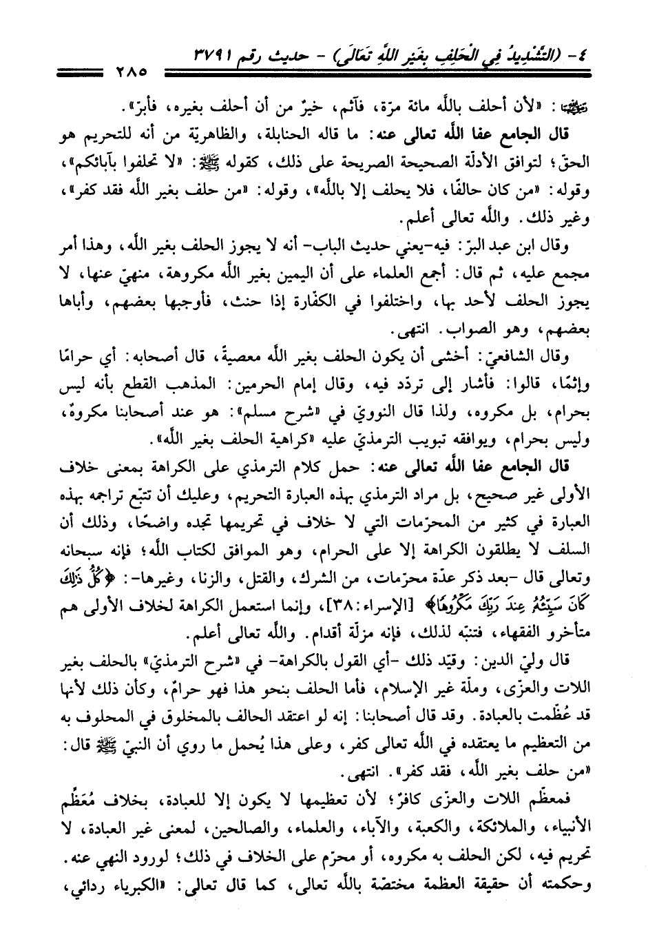 قال وليّ الدين: وقيد ذلك -أي القول بالكراهة- في "شرح الترمذيّ" بالحلف بغير اللات والعزّى، وملّة غير الإسلام، فأما الحلف بنحو هذا فهو حرامٌ، وكأن ذلك لأنها قد عُظمت بالعبادة. وقد قال أصحابنا: إنه لو اعتقد الحالف بالمخلوق في المحلوف به من التعظيم ما يعتقده في اللَّه تعالى كفر، وعلى هذا يُحمل ما روي أن النبيّ - صلى اللَّه عليه وسلم - قال: "من حلف بغير اللَّه، فقد كفر". انتهى.